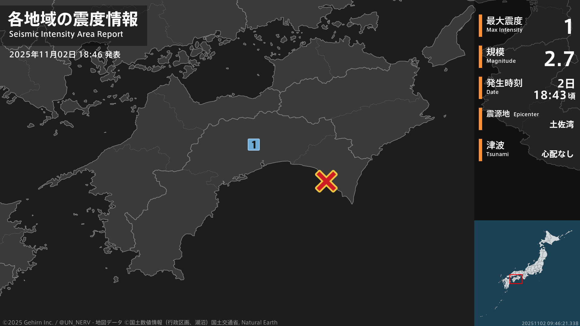 【地震情報 2025年11月2日】18時43分頃、土佐湾を震源とする地震がありました。震源の深さは約30km、地震の規模はM2.7、最大震度1を高知県で観測しています。この地震による津波の心配はありません。#地震 #高知県