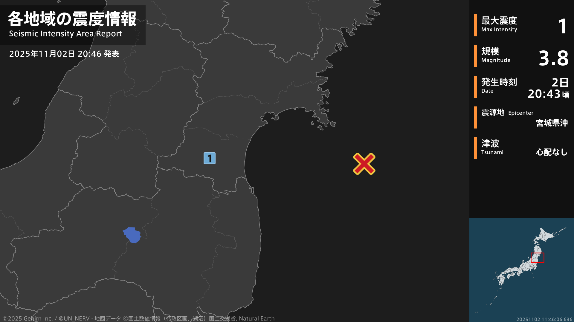 【地震情報 2025年11月2日】20時43分頃、宮城県沖を震源とする地震がありました。震源の深さは約60km、地震の規模はM3.8、最大震度1を宮城県で観測しています。この地震による津波の心配はありません。#地震 #宮城県