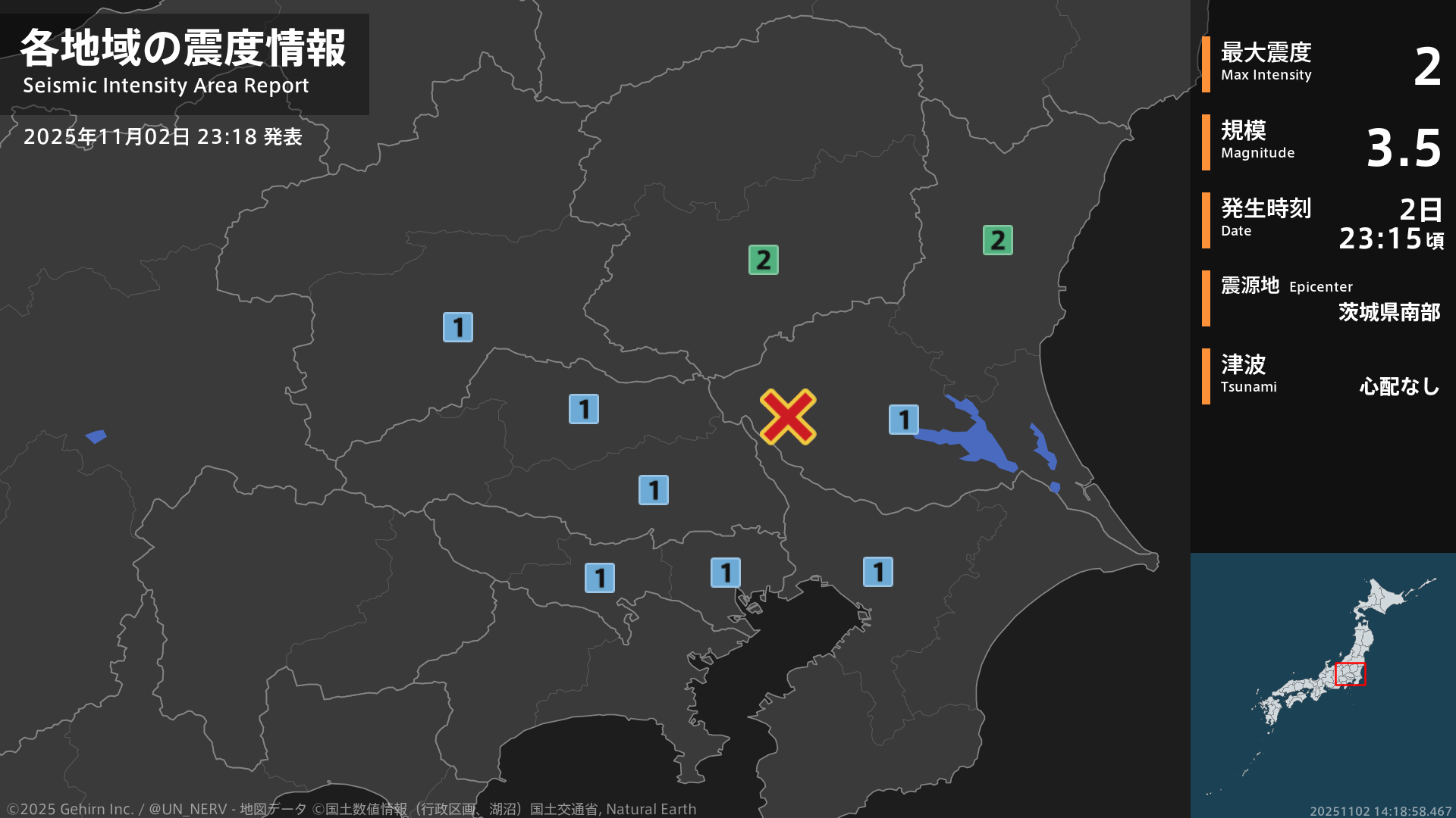 【地震情報 2025年11月2日】23時15分頃、茨城県南部を震源とする地震がありました。震源の深さは約40km、地震の規模はM3.5、最大震度2を茨城県、栃木県で観測しています。この地震による津波の心配はありません。#地震 #茨城県 #栃木県 #群馬県 #埼玉県 #千葉県 #東京都