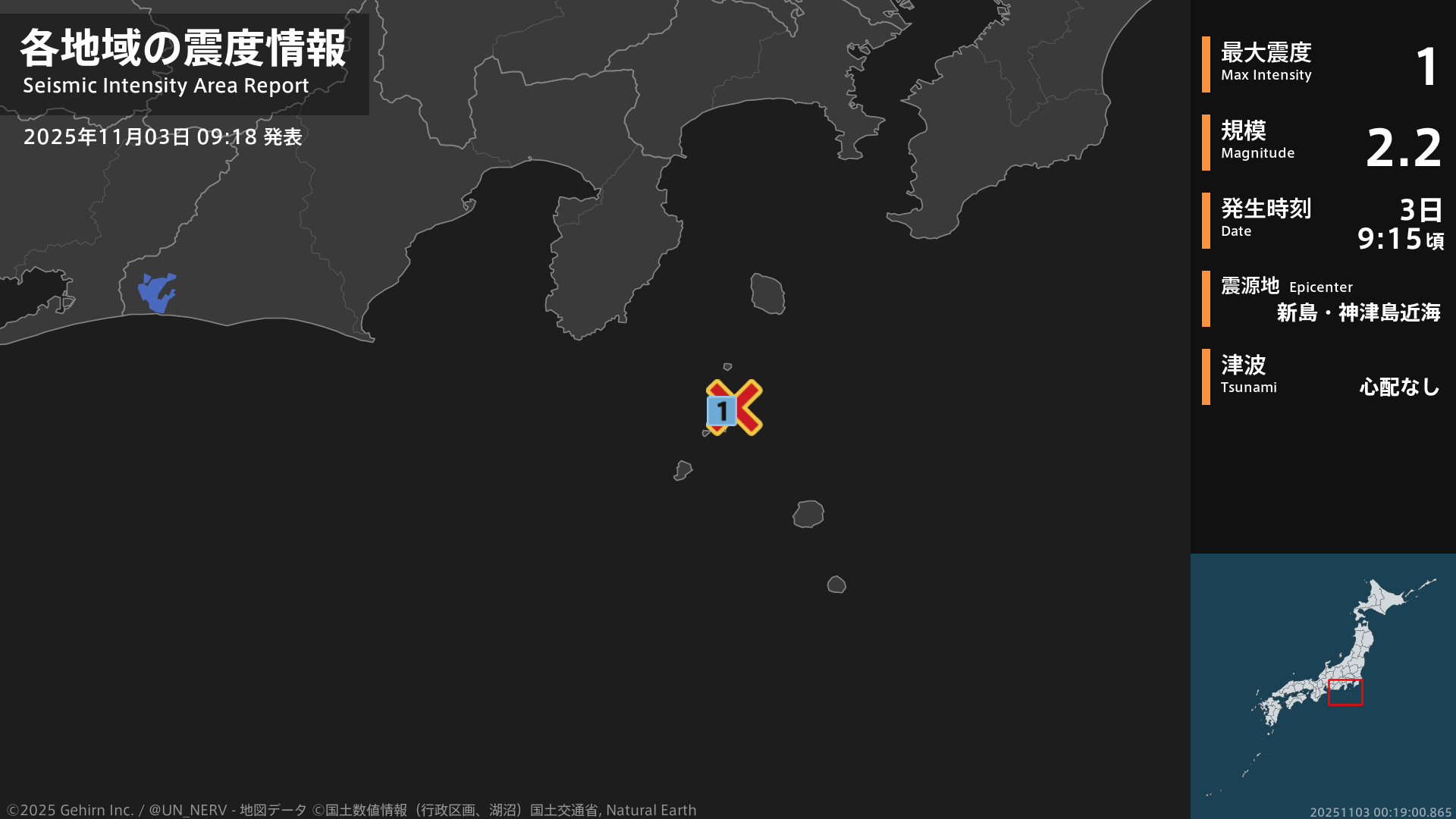 【地震情報 2025年11月3日】9時15分頃、新島・神津島近海を震源とする地震がありました。震源の深さはごく浅い、地震の規模はM2.2、最大震度1を東京都で観測しています。この地震による津波の心配はありません。#地震 #東京都