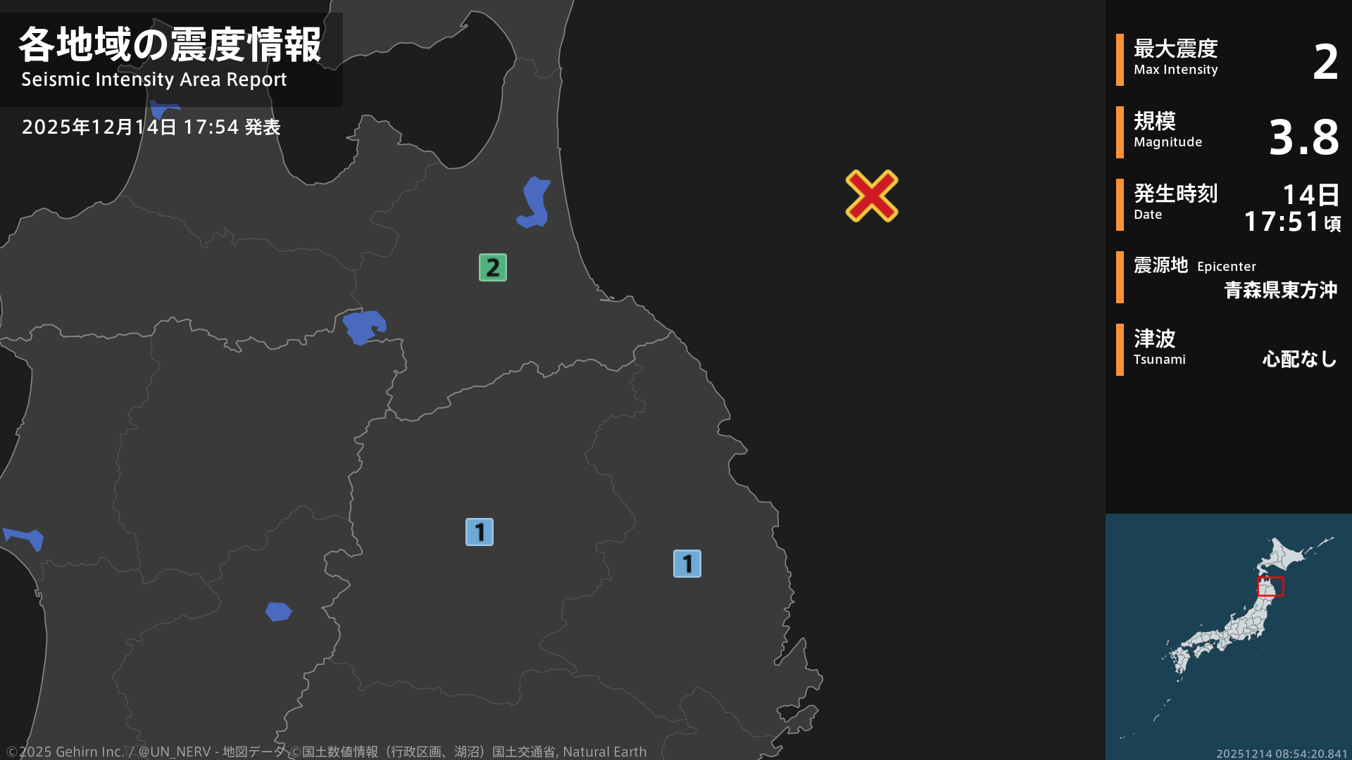 【地震情報 2025年12月14日】17時51分頃、青森県東方沖を震源とする地震がありました。震源の深さは約60km、地震の規模はM3.8、最大震度2を青森県で観測しています。この地震による津波の心配はありません。#地震 #青森県 #岩手県