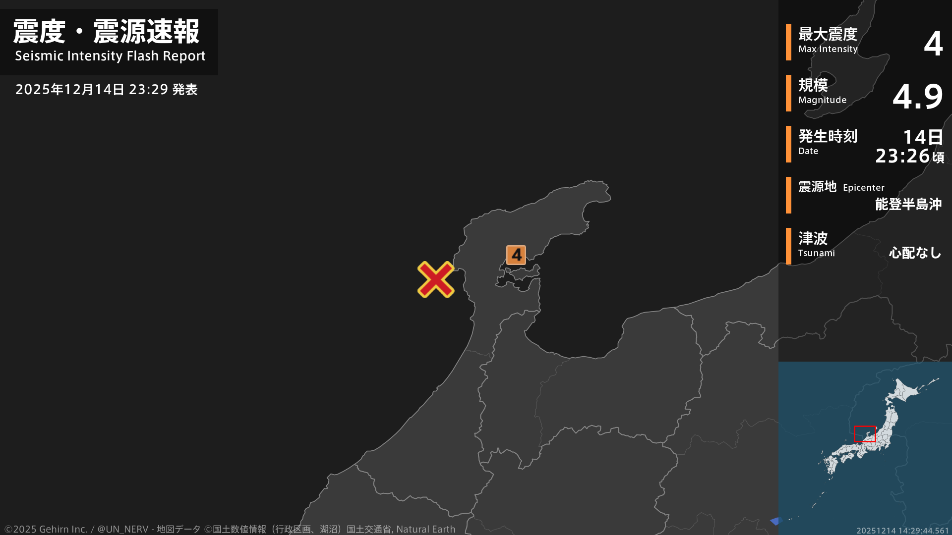 【地震情報 2025年12月14日】23時26分頃、能登半島沖を震源とする地震がありました。震源の深さは約10km、地震の規模はM4.9、最大震度4を石川県で観測しています。この地震による津波の心配はありません。#地震 #石川県 #富山県 #岐阜県 #新潟県 #福井県 #長野県