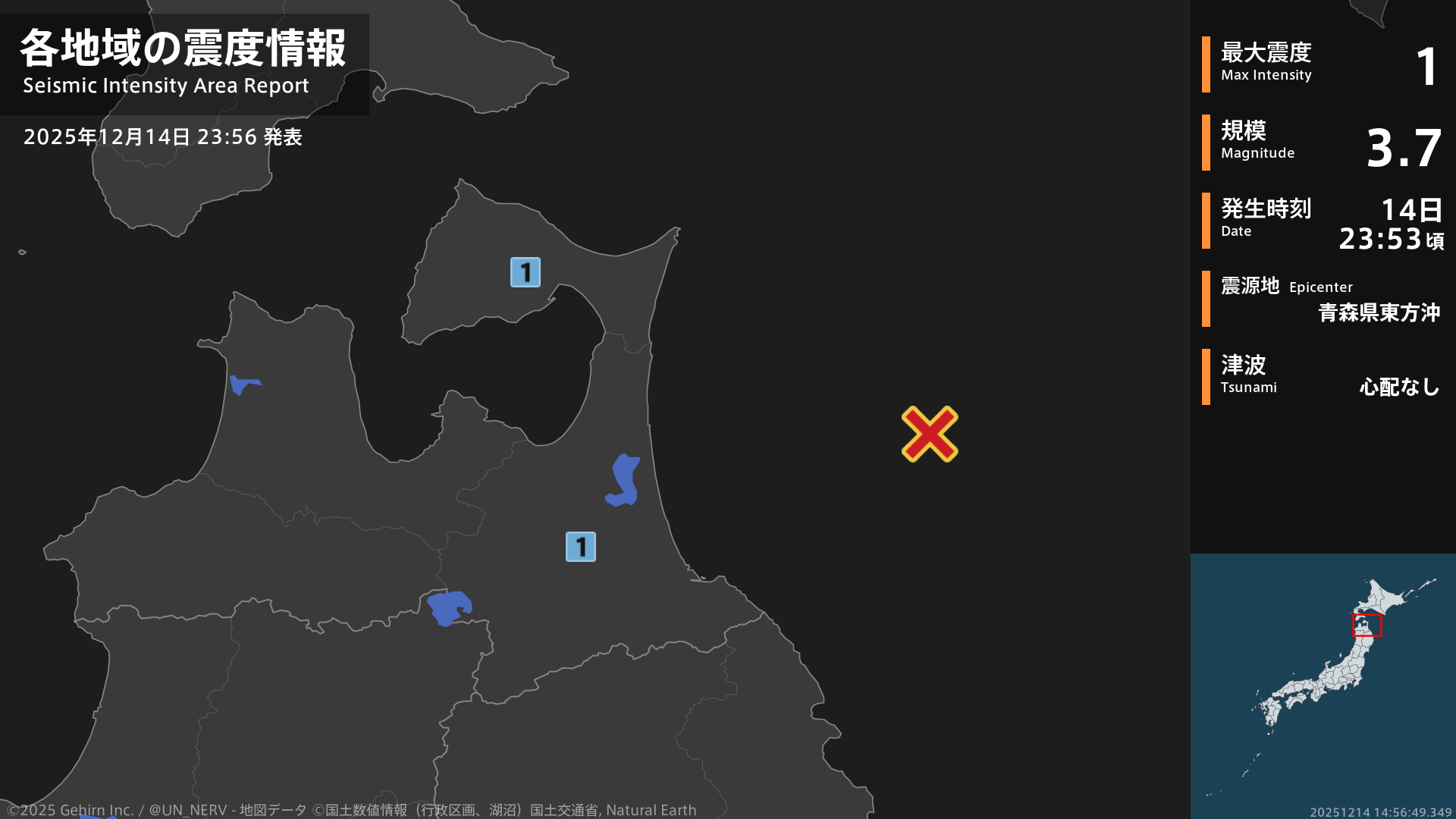 【地震情報 2025年12月14日】23時53分頃、青森県東方沖を震源とする地震がありました。震源の深さは約60km、地震の規模はM3.7、最大震度1を青森県で観測しています。この地震による津波の心配はありません。#地震 #青森県