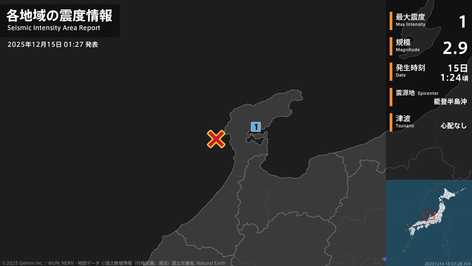 【地震情報 2025年12月15日】1時24分頃、能登半島沖を震源とする地震がありました。震源の深さは約10km、地震の規模はM2.9、最大震度1を石川県で観測しています。この地震による津波の心配はありません。#地震 #石川県