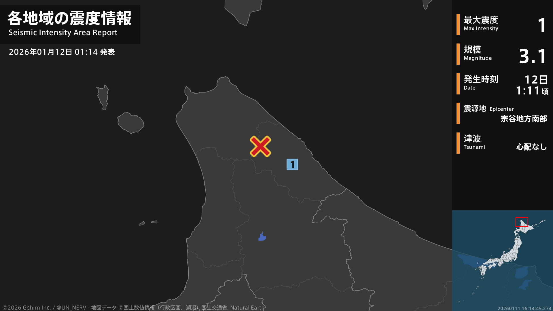 【地震情報 2026年1月12日】1時11分頃、宗谷地方南部を震源とする地震がありました。震源の深さはごく浅い、地震の規模はM3.1、最大震度1を北海道で観測しています。この地震による津波の心配はありません。#地震 #北海道