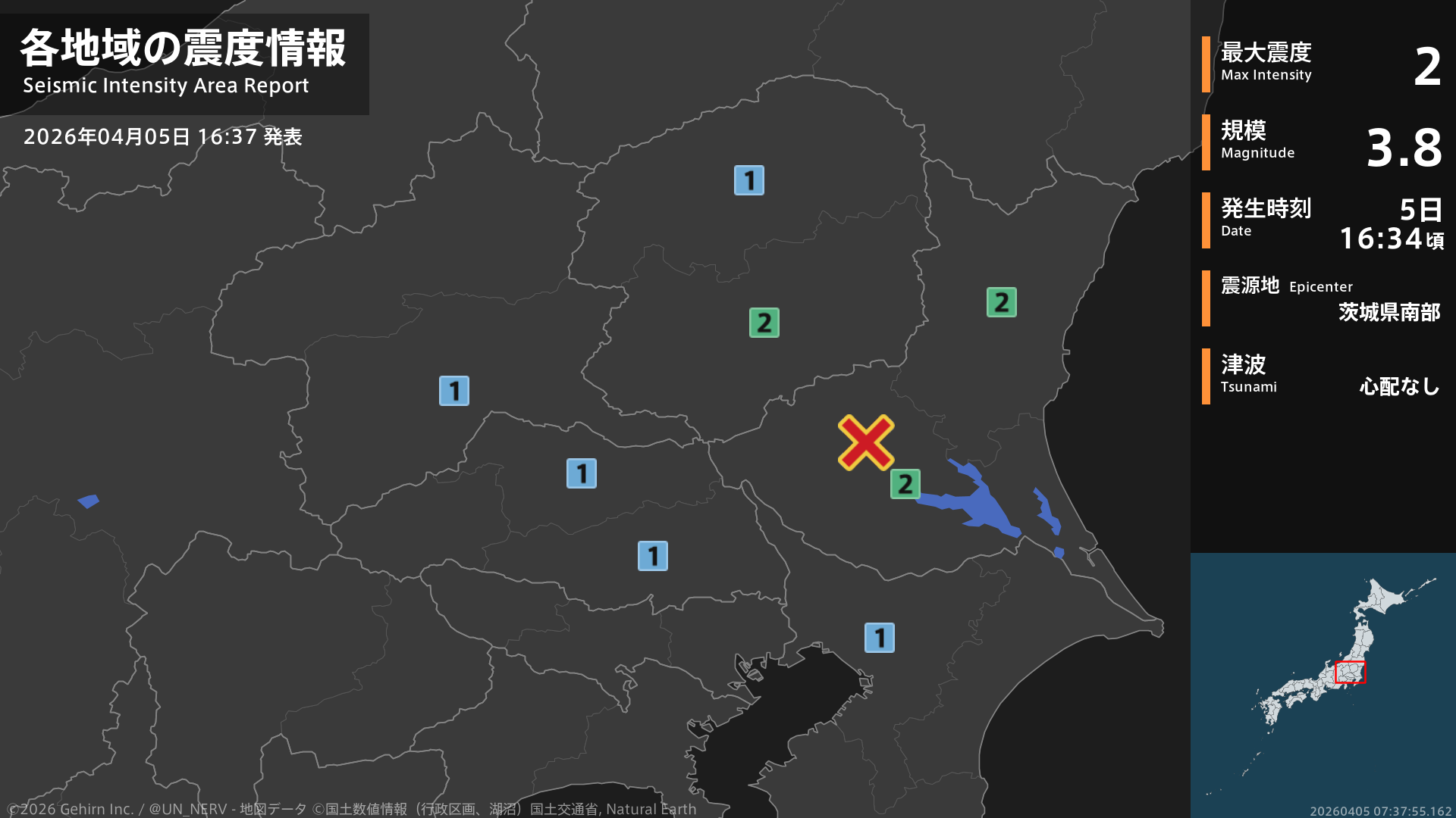 【地震情報 2026年4月5日】16時34分頃、茨城県南部を震源とする地震がありました。震源の深さは約50km、地震の規模はM3.8、最大震度2を茨城県、栃木県で観測しています。この地震による津波の心配はありません。#地震 #茨城県 #栃木県 #群馬県 #埼玉県 #千葉県