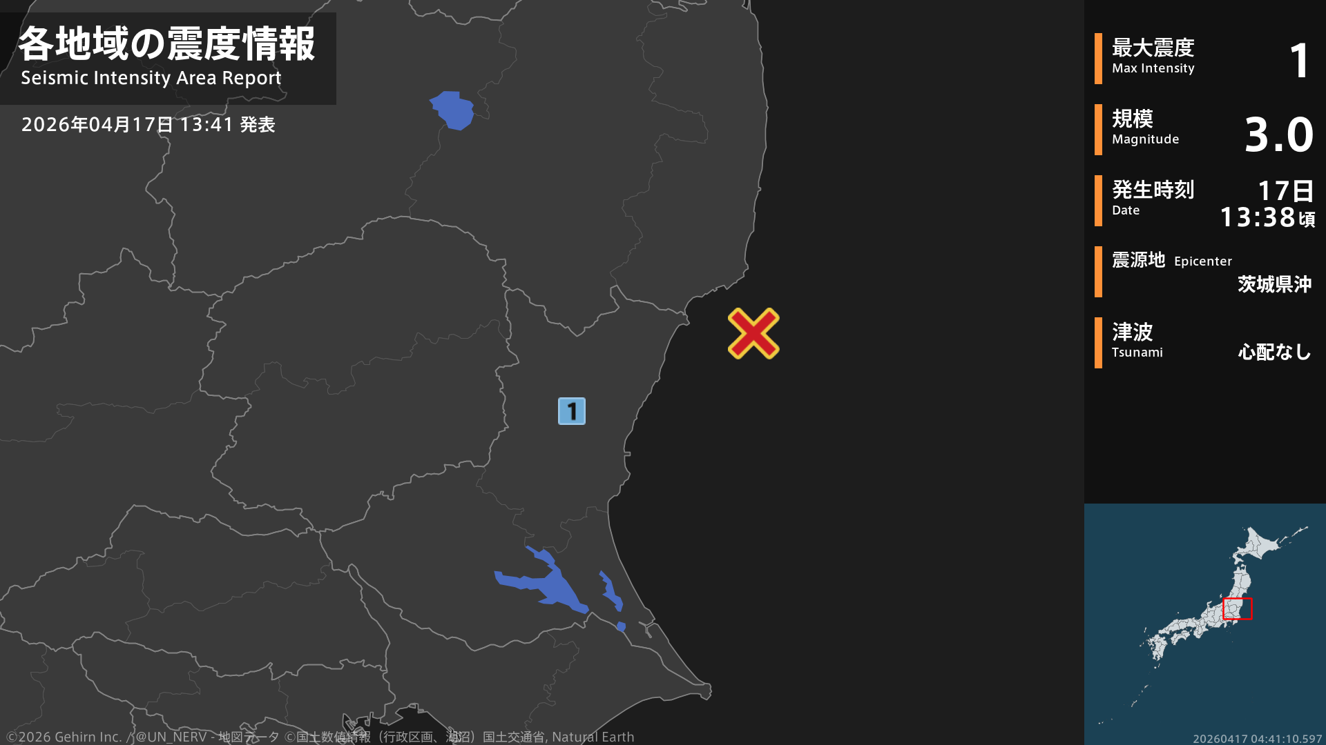 【地震情報 2026年4月17日】13時38分頃、茨城県沖を震源とする地震がありました。震源の深さは約50km、地震の規模はM3.0、最大震度1を茨城県で観測しています。この地震による津波の心配はありません。#地震 #茨城県
