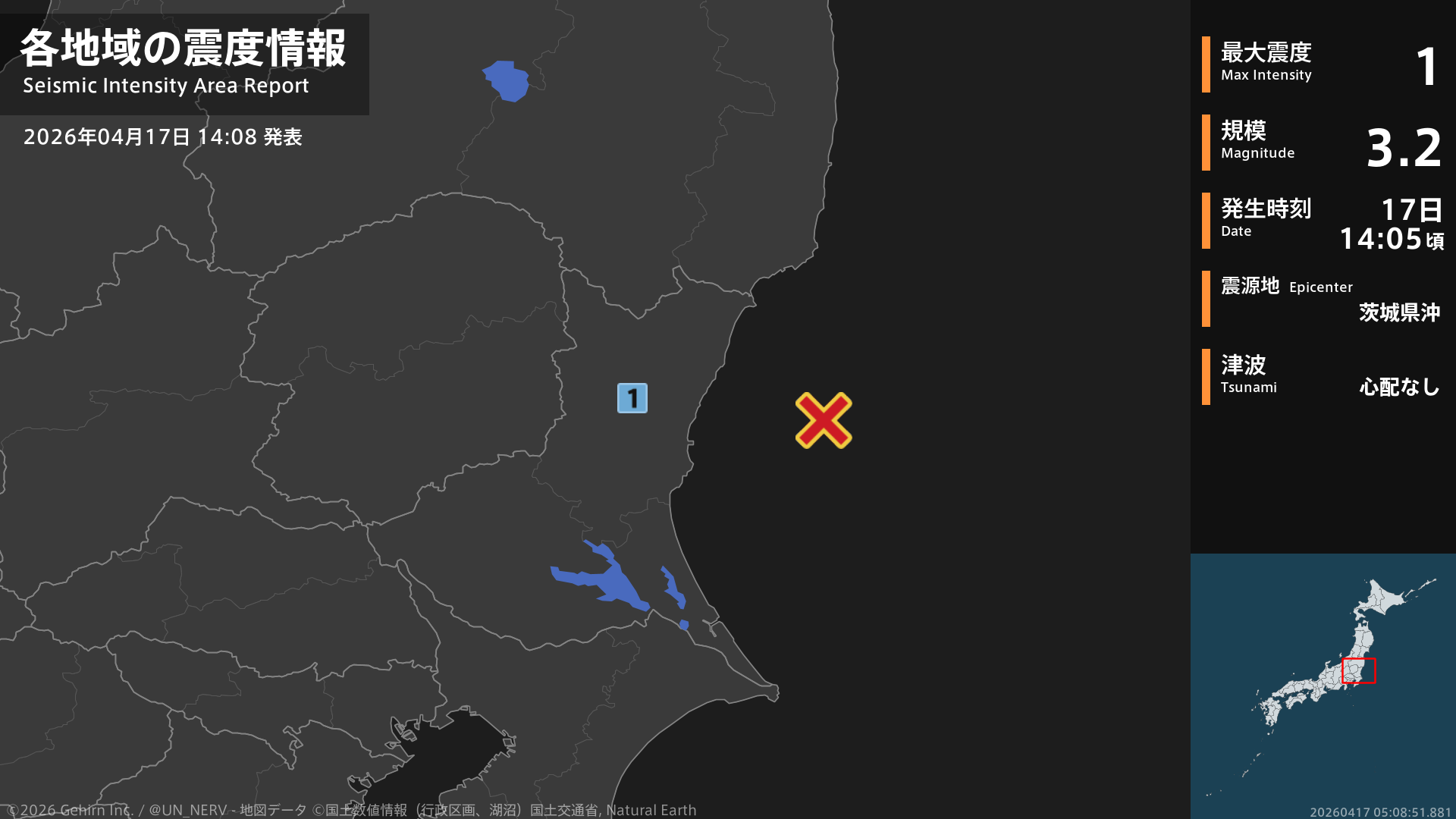 【地震情報 2026年4月17日】14時5分頃、茨城県沖を震源とする地震がありました。震源の深さは約40km、地震の規模はM3.2、最大震度1を茨城県で観測しています。この地震による津波の心配はありません。#地震 #茨城県