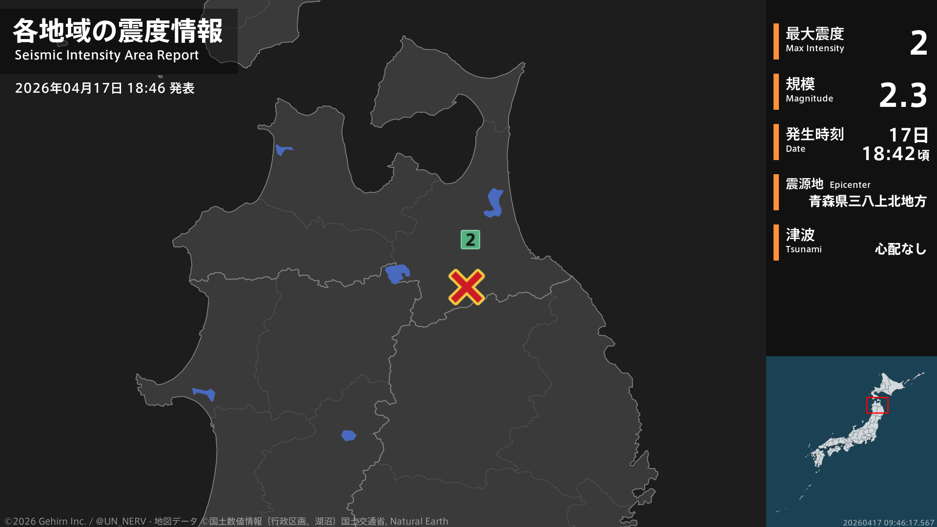 【地震情報 2026年4月17日】18時42分頃、青森県三八上北地方を震源とする地震がありました。震源の深さは約10km、地震の規模はM2.3、最大震度2を青森県で観測しています。この地震による津波の心配はありません。#地震 #青森県