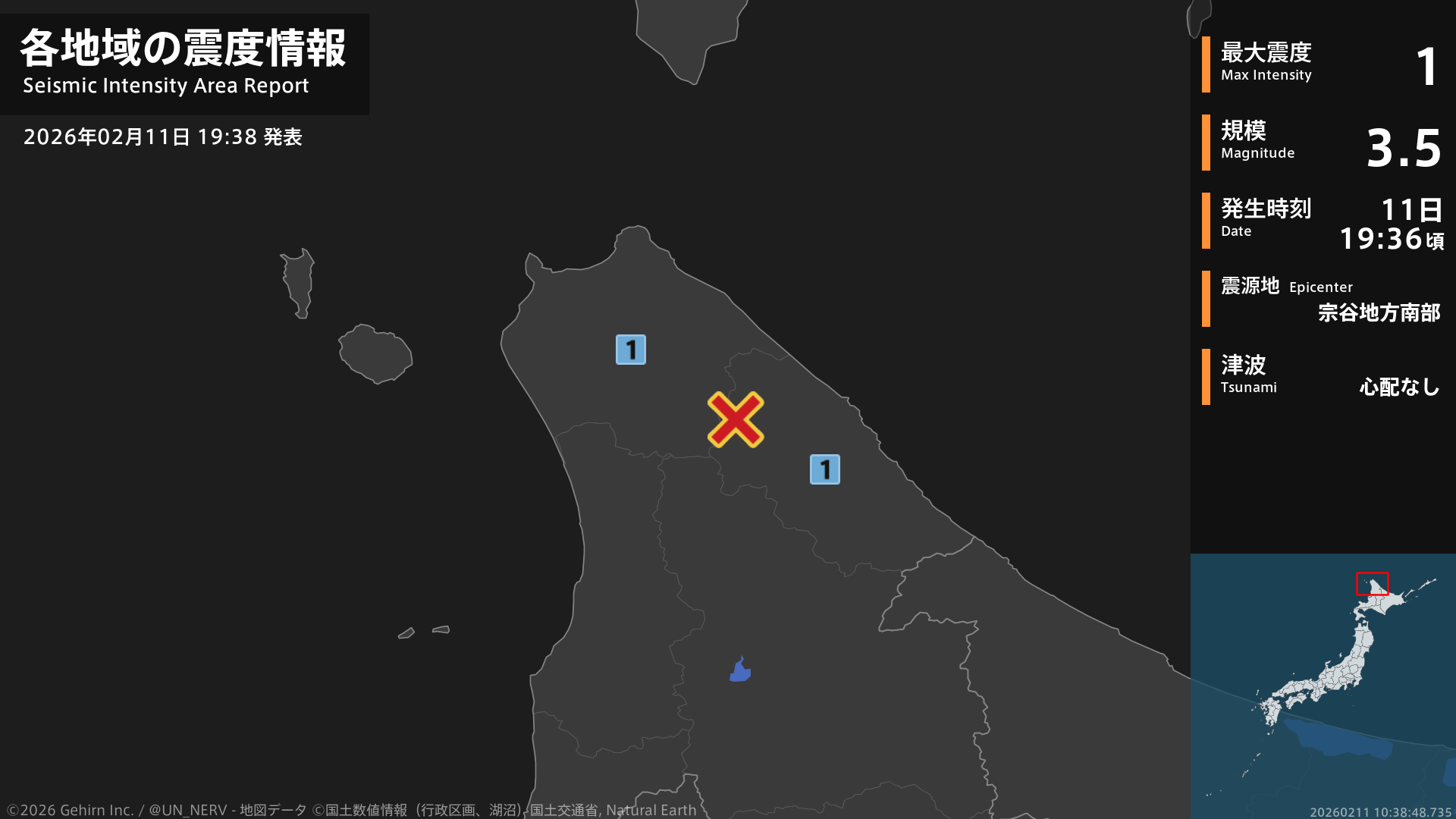 19時36分頃、宗谷地方南部を震源とする地震がありました。震源の深さはごく浅い、地震の規模はM3.5、最大震度1を北海道で観測しています。この地震による津波の心配はありません。