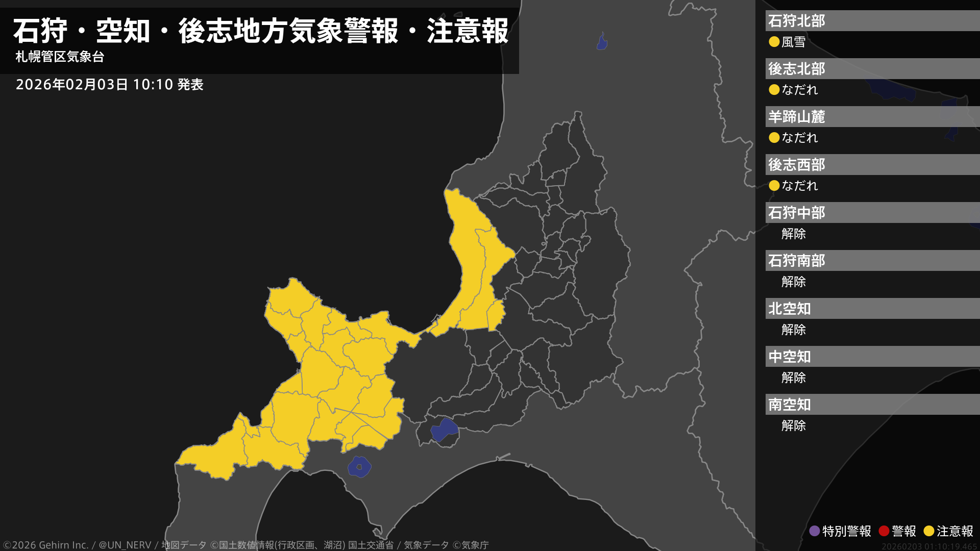 【石狩・空知・後志地方 気象警報・注意報 2026年02月03日 10:10】