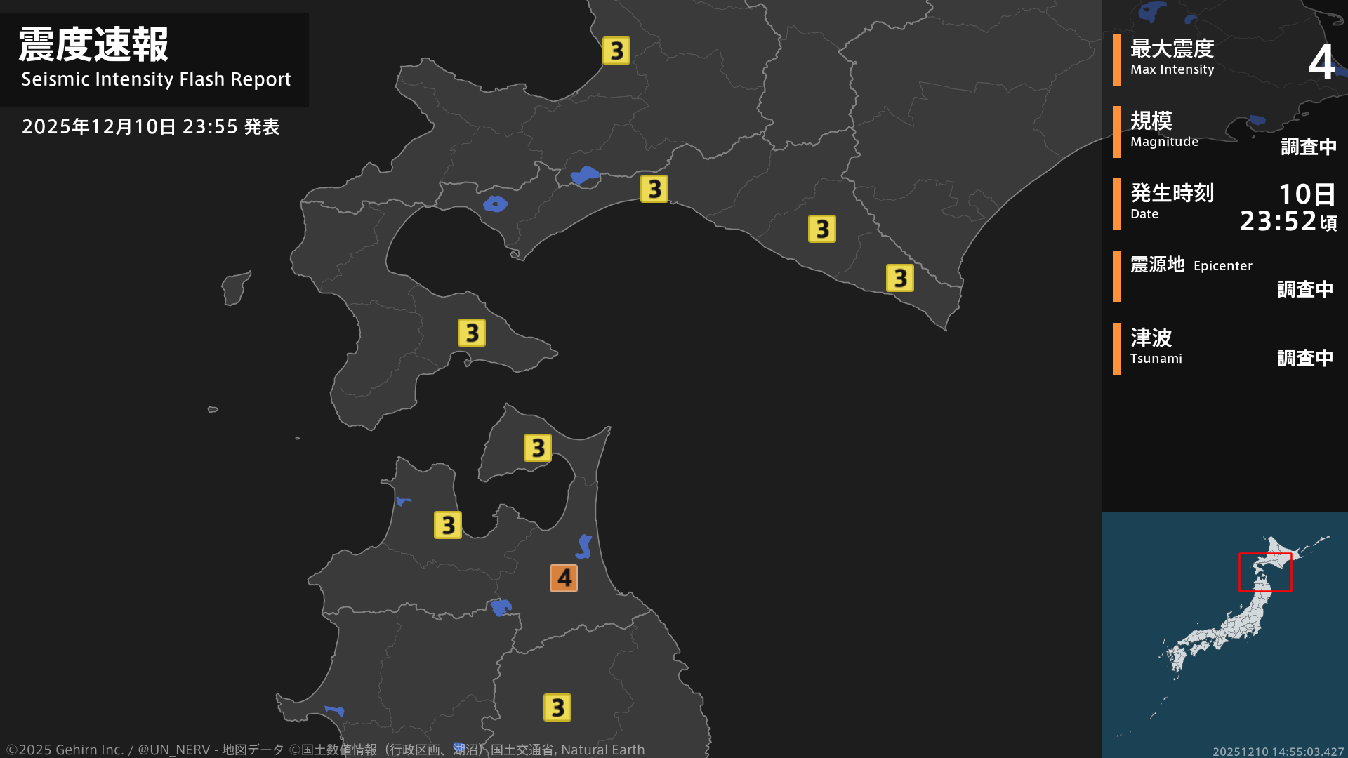 【地震 23:52】[震度4]青森三八上北[震度3]石狩北部、渡島東部、胆振中東部、日高中部、日高東部、青森津軽北部、青森下北、岩手内陸北部#地震 #青森県 #北海道 #岩手県