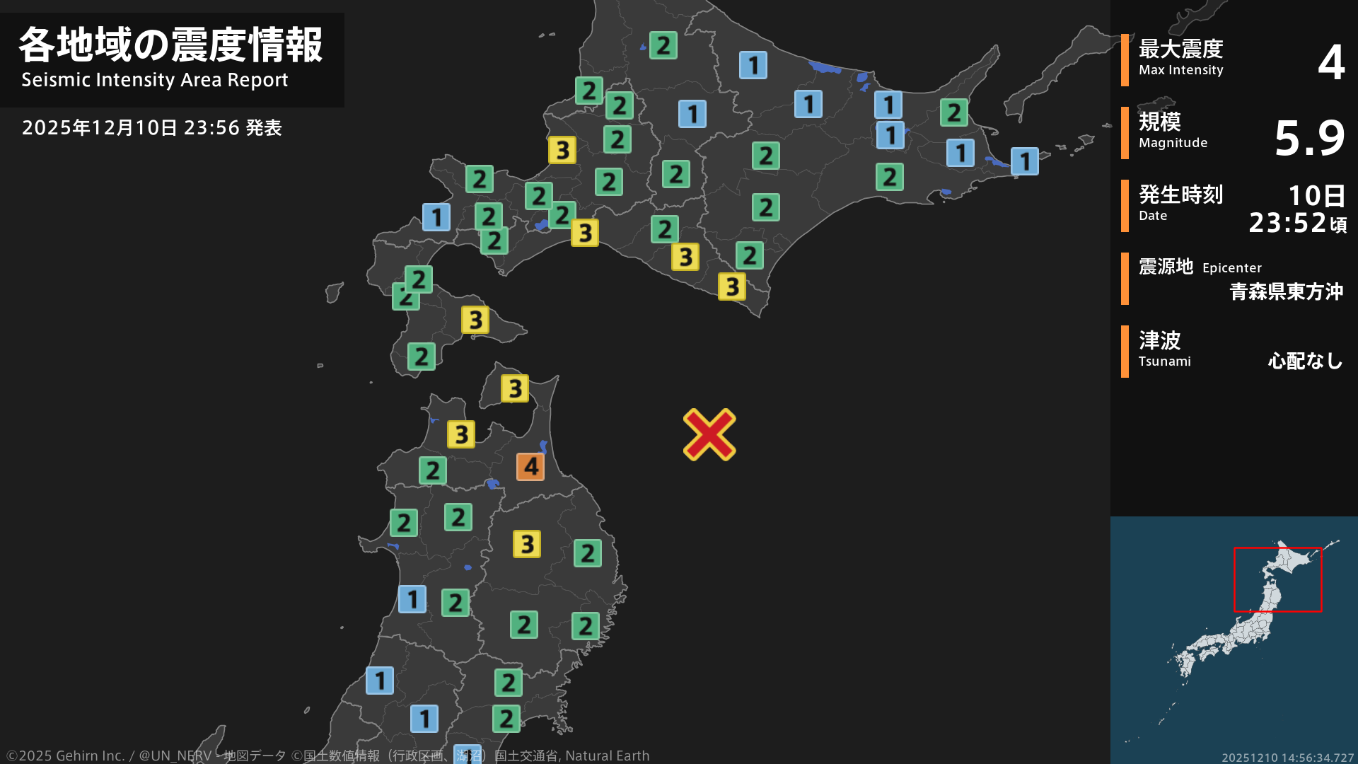 【地震情報 2025年12月10日】23時52分頃、青森県東方沖を震源とする地震がありました。震源の深さは約30km、地震の規模はM5.9、最大震度4を青森県で観測しています。この地震による津波の心配はありません。#地震 #青森県 #北海道 #岩手県 #宮城県 #秋田県 #山形県 #福島県
