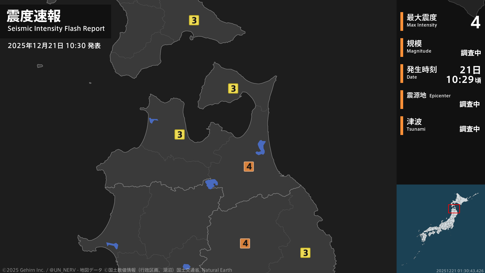 [震度3]渡島東部、青森津軽北部、青森下北、岩手沿岸北部