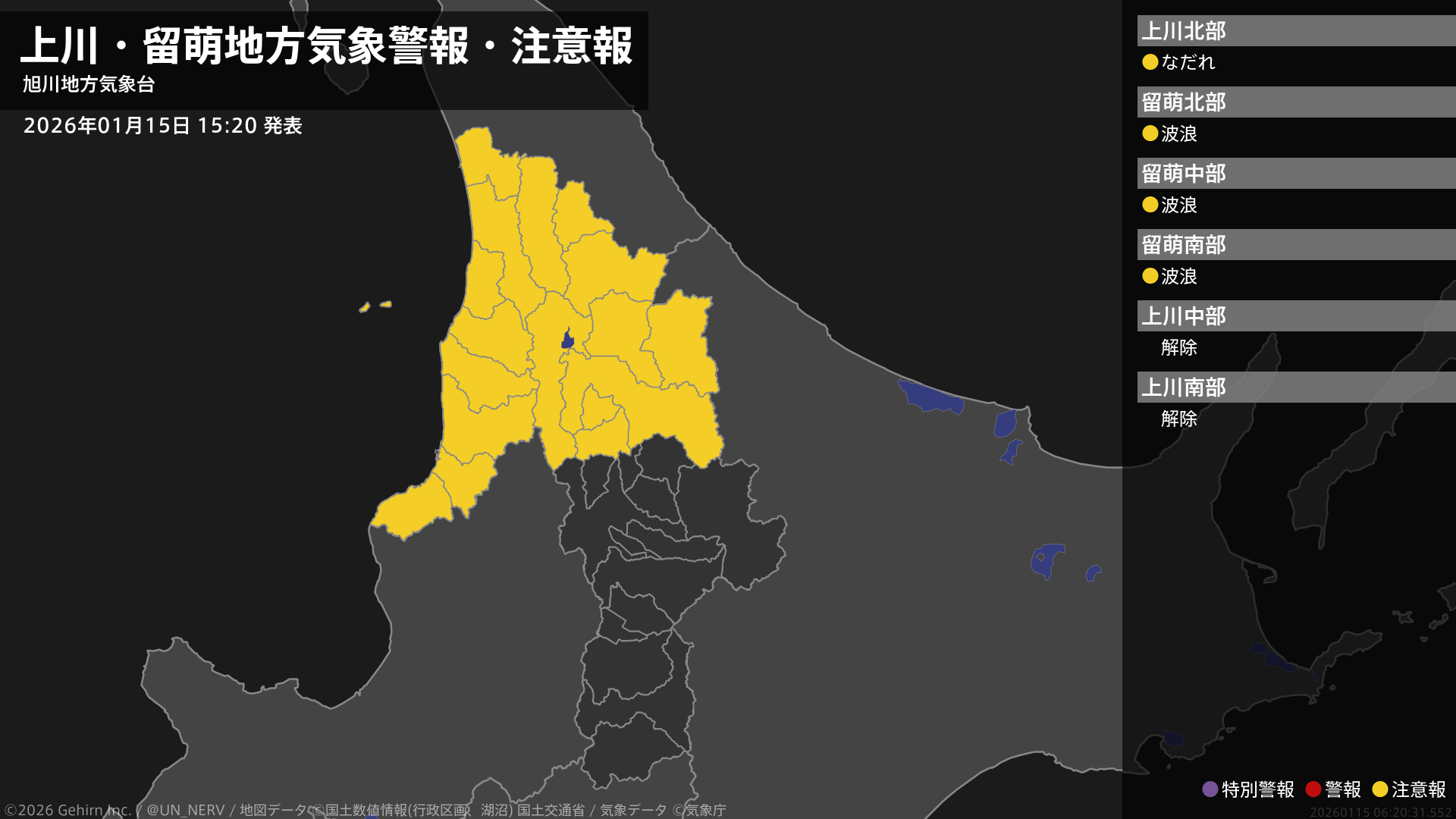 【上川・留萌地方 気象警報・注意報 2026年01月15日 15:20】