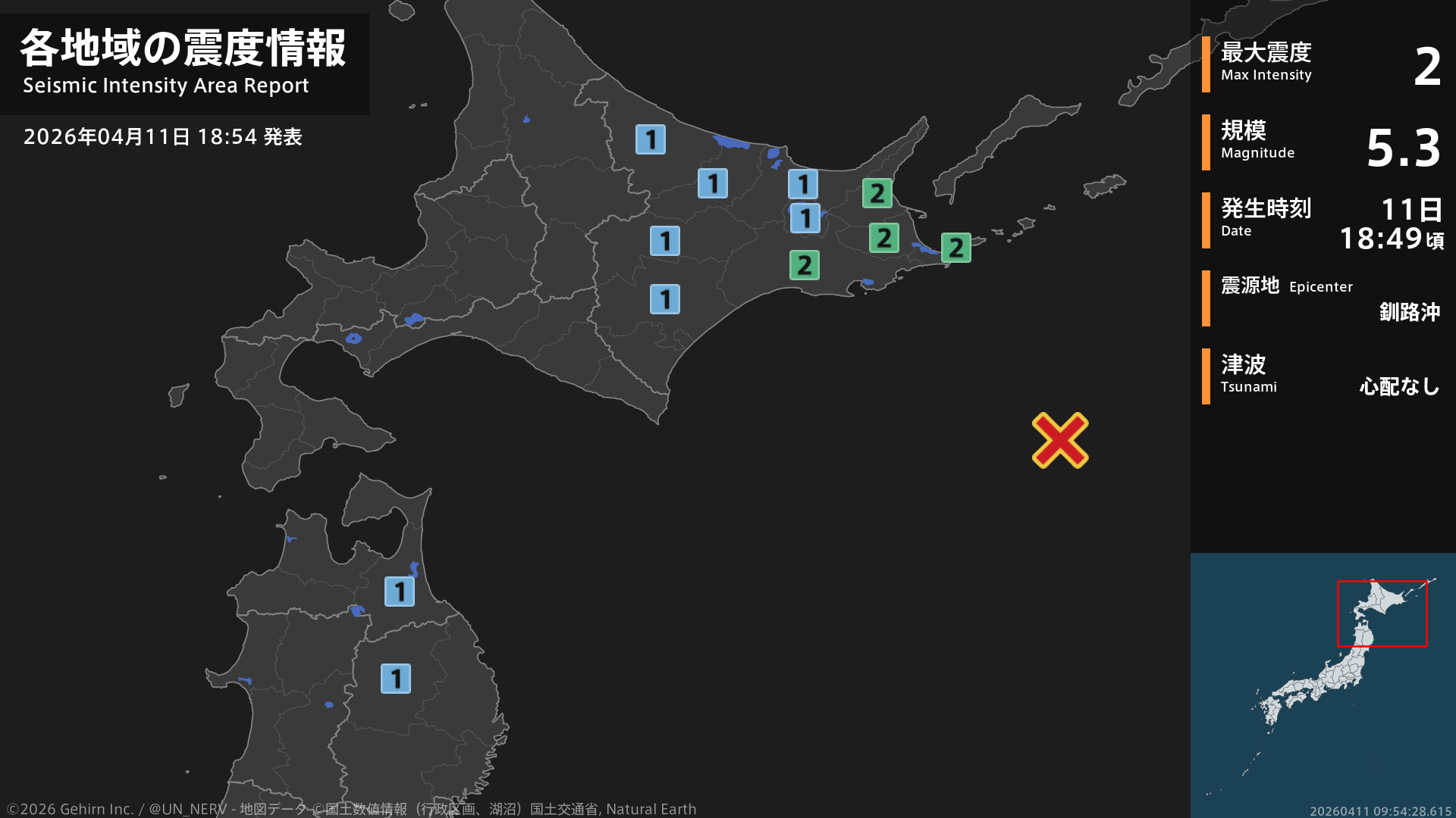 【地震情報 2026年4月11日】18時49分頃、釧路沖を震源とする地震がありました。震源の深さは約10km、地震の規模はM5.3、最大震度2を北海道で観測しています。この地震による津波の心配はありません。#地震 #北海道 #青森県 #岩手県
