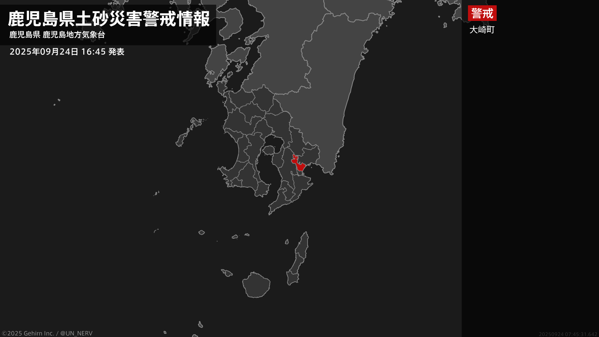 【鹿児島県 土砂災害警戒情報 2025年09月24日 16:45】鹿児島県の警戒対象地域では土砂災害の危険度が高まっています。身の安全を確保するよう努めてください。#土砂災害警戒情報 #鹿児島県