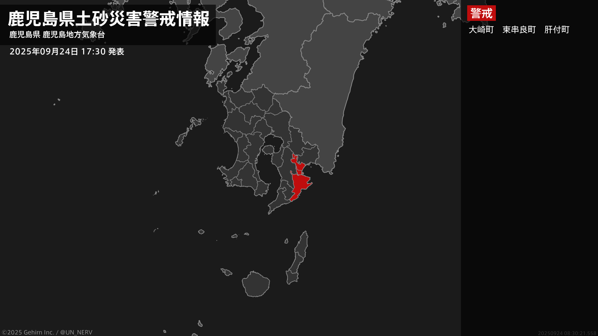 【鹿児島県 土砂災害警戒情報 2025年09月24日 17:30】鹿児島県の警戒対象地域では土砂災害の危険度が高まっています。身の安全を確保するよう努めてください。#土砂災害警戒情報 #鹿児島県