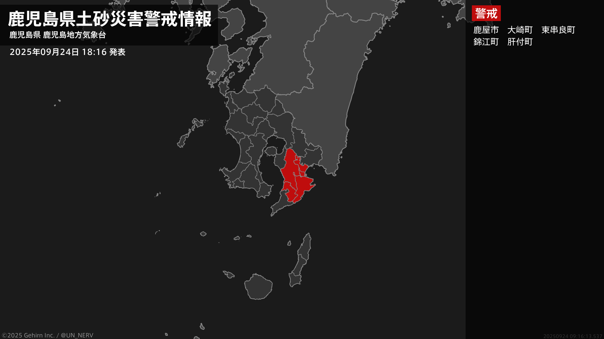 【鹿児島県 土砂災害警戒情報 2025年09月24日 18:16】鹿児島県の警戒対象地域では土砂災害の危険度が高まっています。身の安全を確保するよう努めてください。#土砂災害警戒情報 #鹿児島県