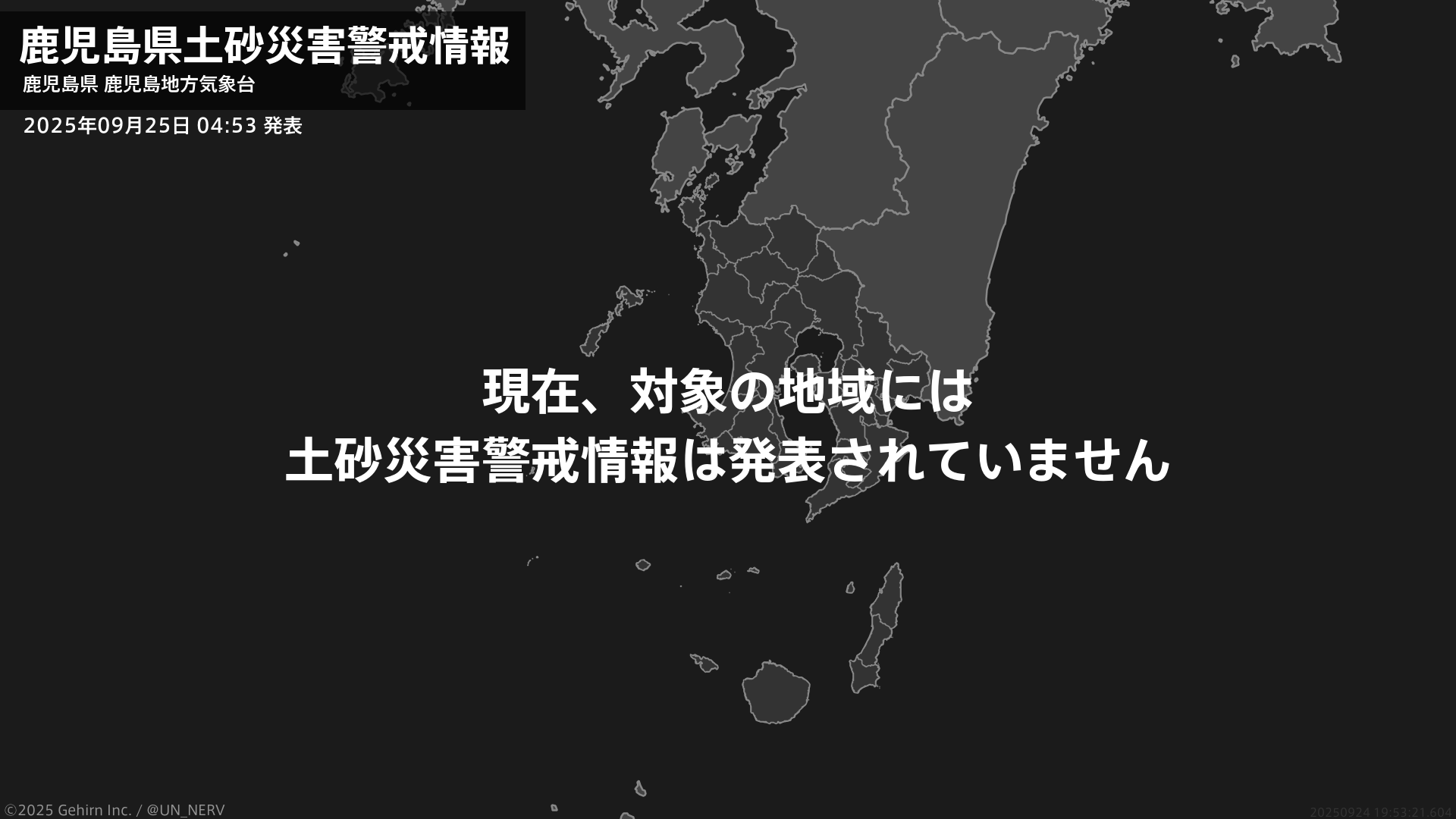 【鹿児島県 土砂災害警戒情報 2025年09月25日 04:53】鹿児島県に発表されていた土砂災害警戒情報はすべて解除されました。#土砂災害警戒情報 #鹿児島県
