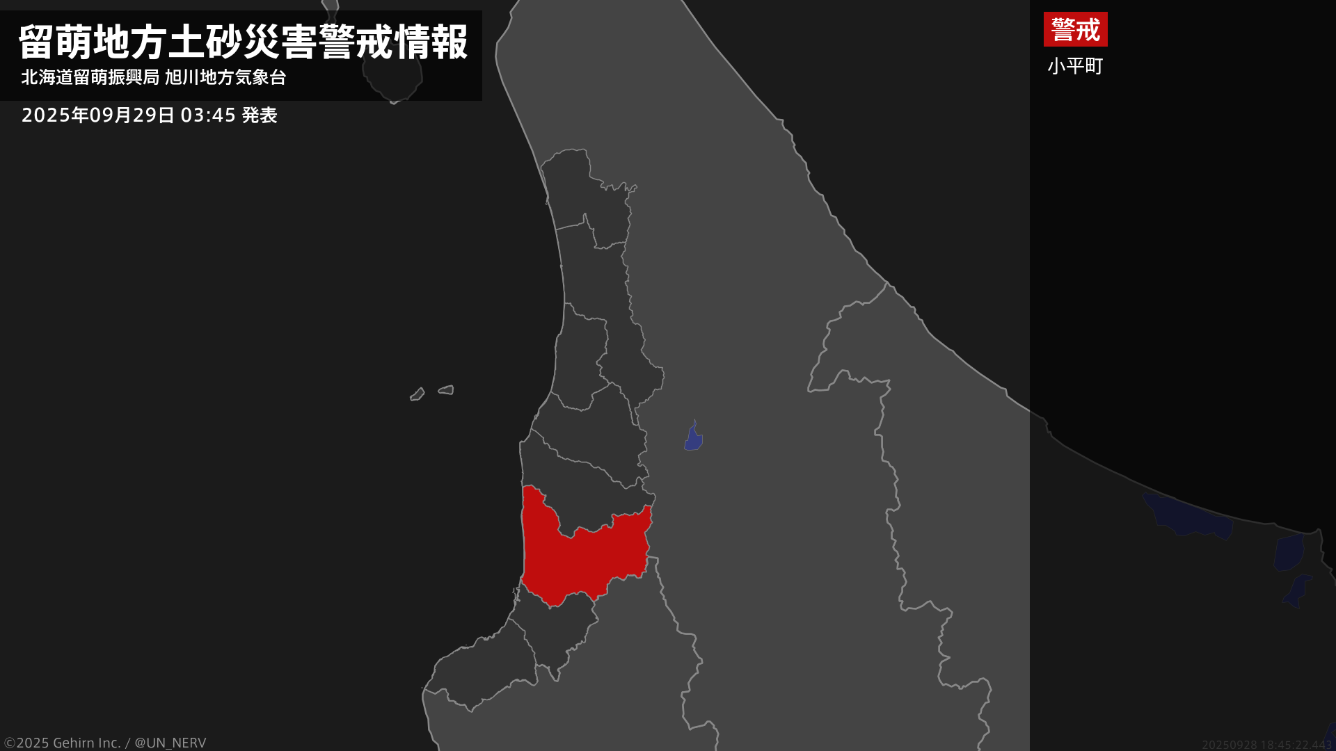 【留萌地方 土砂災害警戒情報 2025年09月29日 03:45】留萌地方の警戒対象地域では土砂災害の危険度が高まっています。身の安全を確保するよう努めてください。#土砂災害警戒情報 #留萌地方