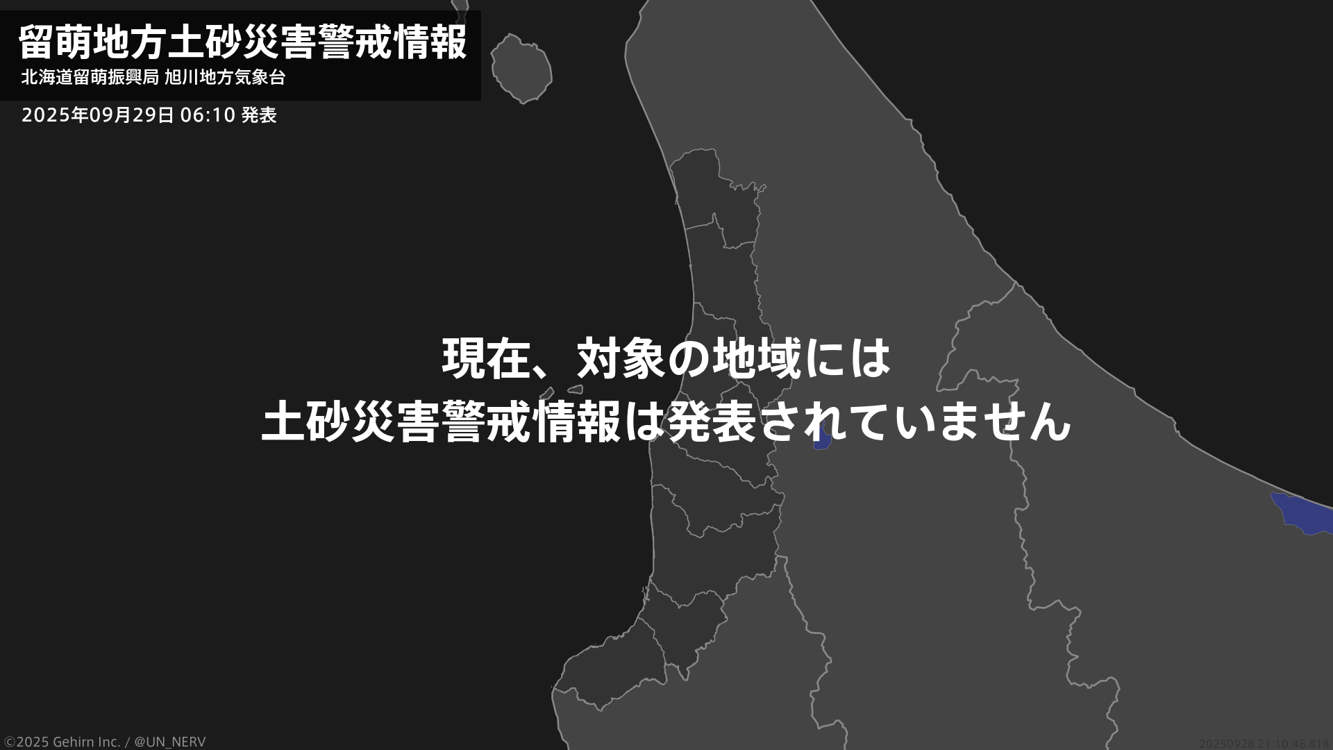 【留萌地方 土砂災害警戒情報 2025年09月29日 06:10】留萌地方に発表されていた土砂災害警戒情報はすべて解除されました。#土砂災害警戒情報 #留萌地方