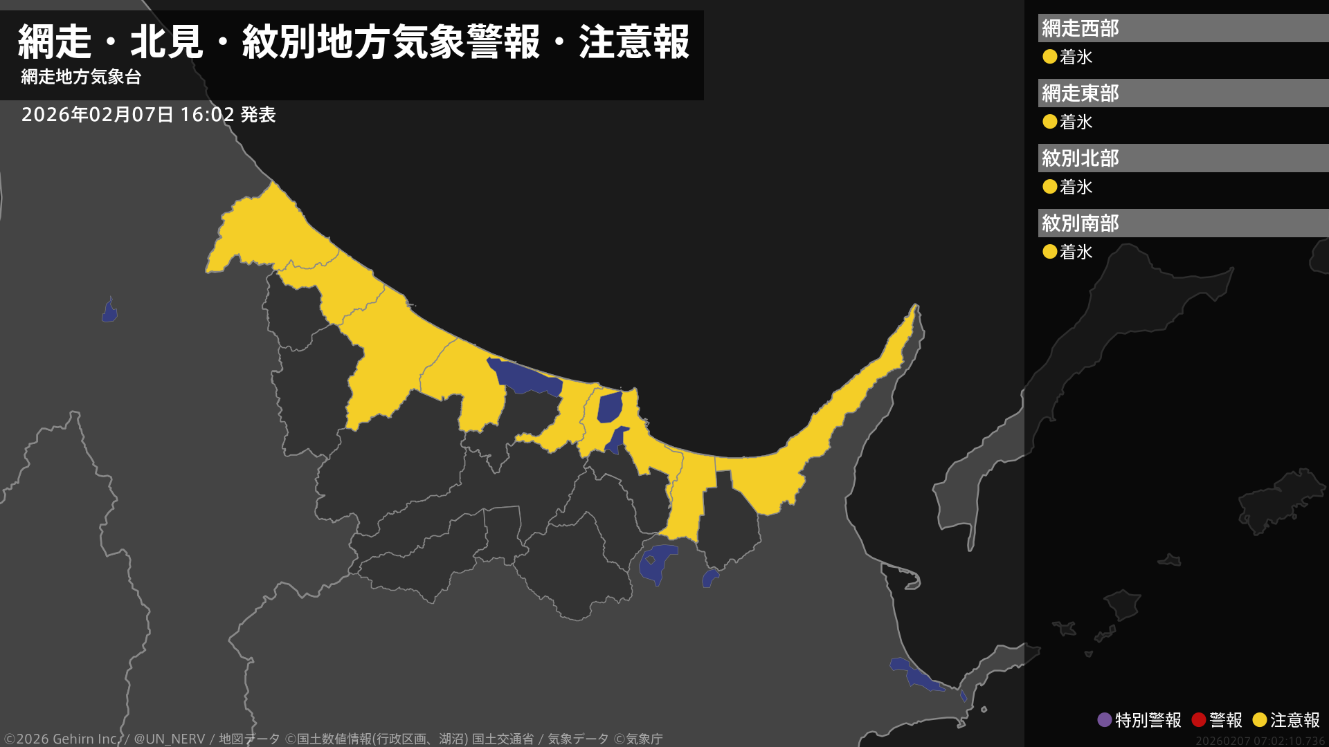 【網走・北見・紋別地方 気象警報・注意報 2026年02月07日 16:02】
