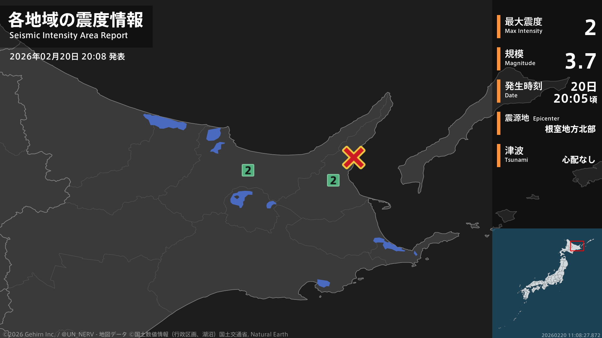 【地震情報 2026年2月20日】20時5分頃、根室地方北部を震源とする地震がありました。震源の深さは約10km、地震の規模はM3.7、最大震度2を北海道で観測しています。この地震による津波の心配はありません。#地震 #北海道