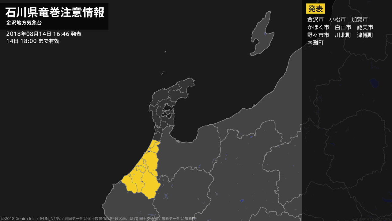 【石川県 竜巻注意情報】石川県は、竜巻などの激しい突風が発生しやすい気象状況になっています。頑丈な建物内に移動するなど安全確保に努めてください。この情報は14日18:00まで有効です。#竜巻注意情報 #石川県