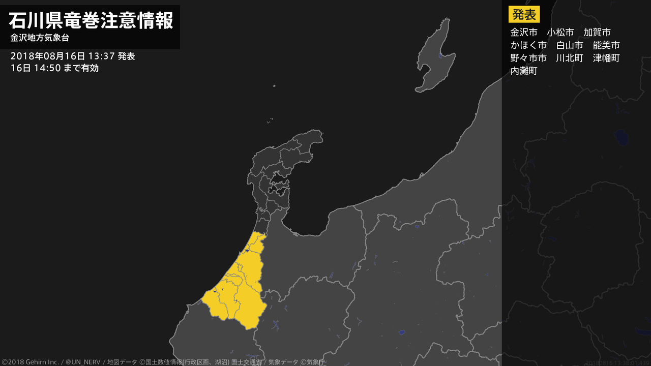 【石川県 竜巻注意情報】石川県は、竜巻などの激しい突風が発生しやすい気象状況になっています。頑丈な建物内に移動するなど安全確保に努めてください。この情報は16日16:00まで有効です。#竜巻注意情報 #石川県