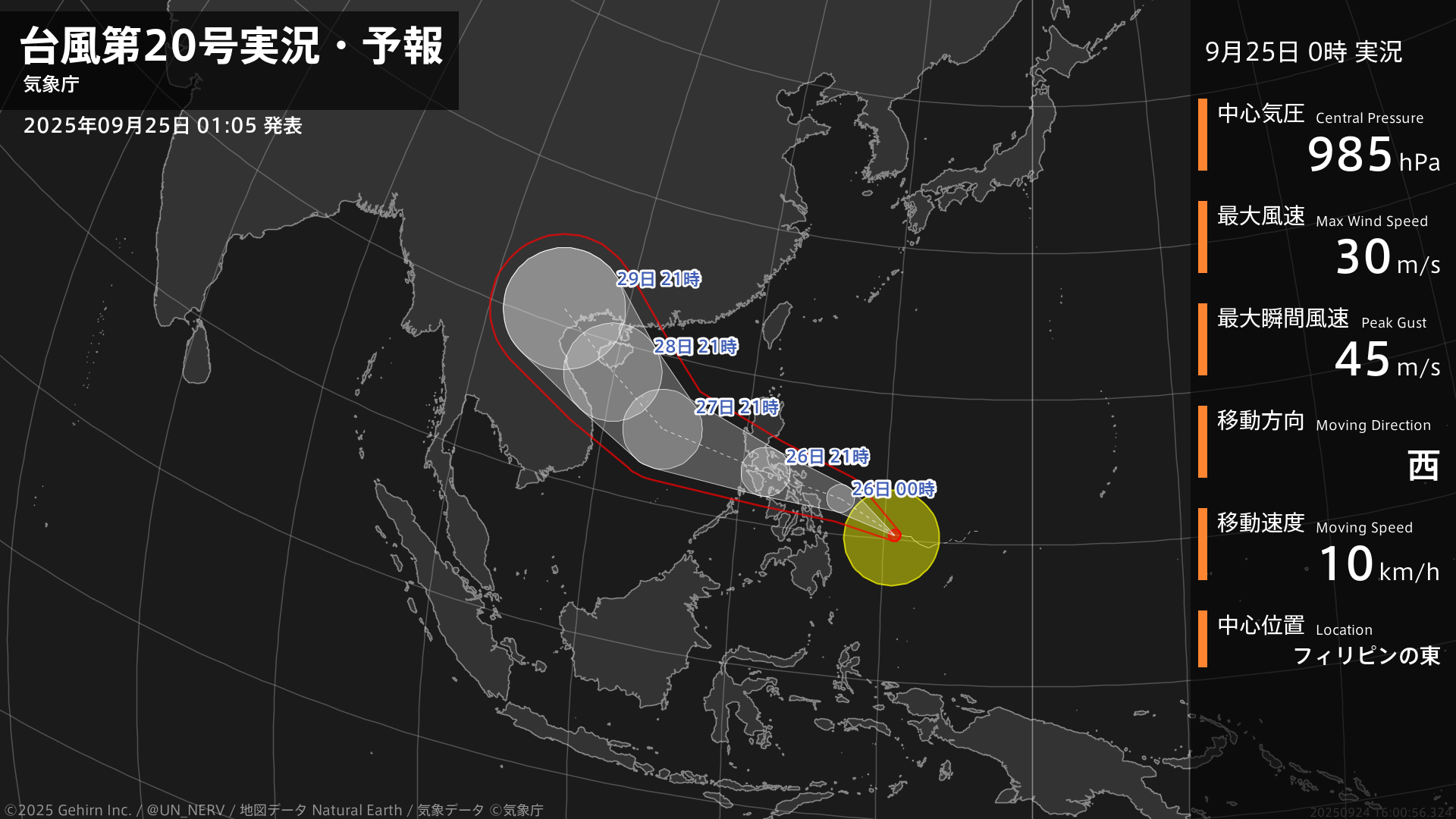 【台風第20号実況・予報 2025年09月25日 01:00】