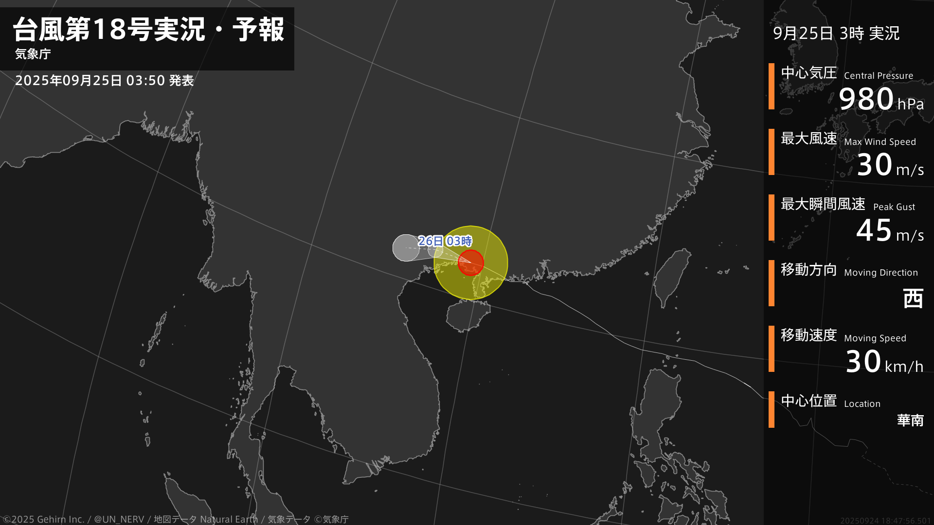 【台風第18号実況・予報 2025年09月25日 03:47】