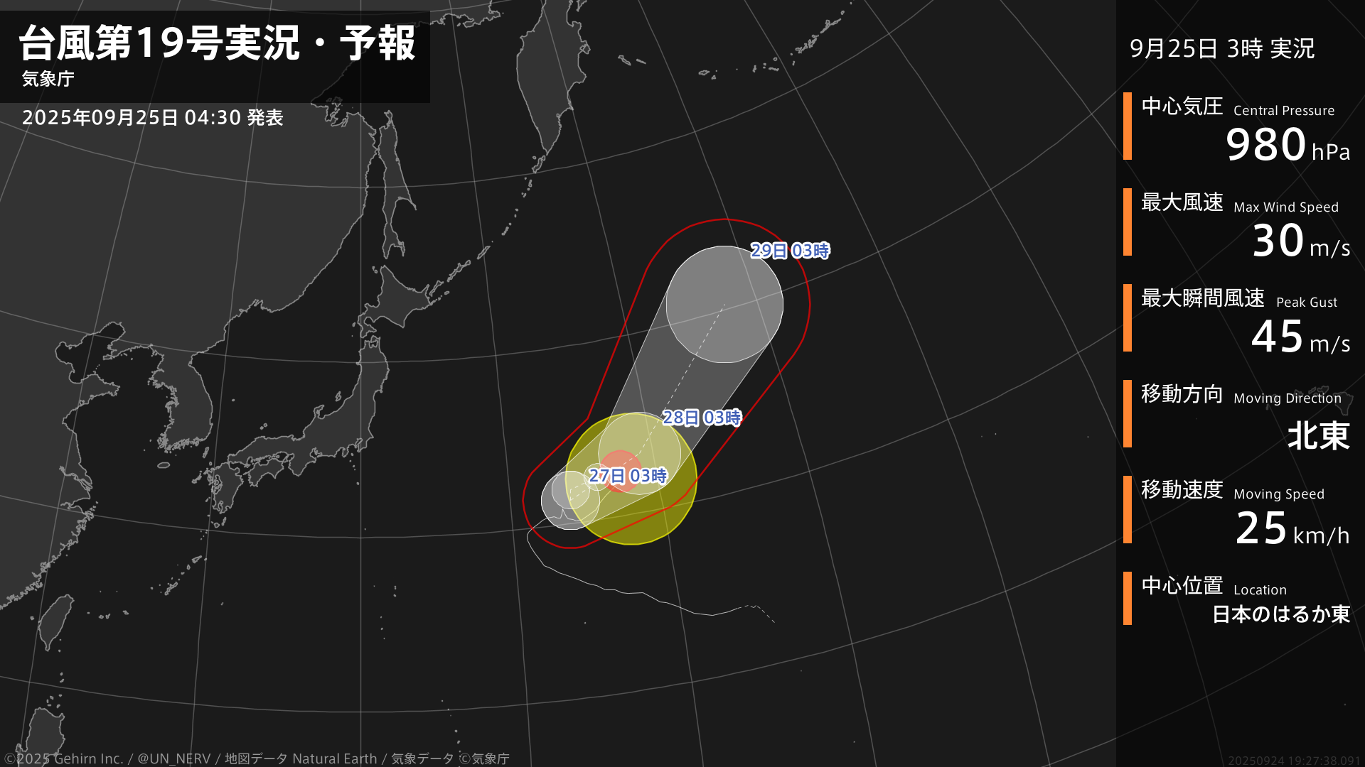 【台風第19号実況・予報 2025年09月25日 04:27】