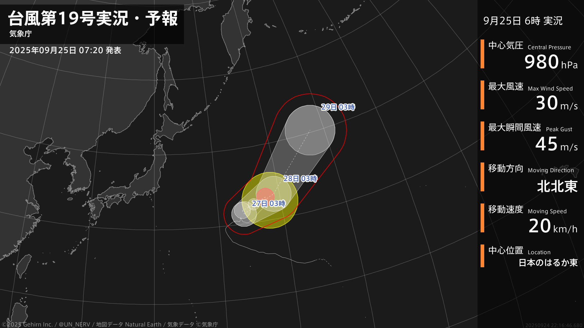 【台風第19号実況・予報 2025年09月25日 07:16】
