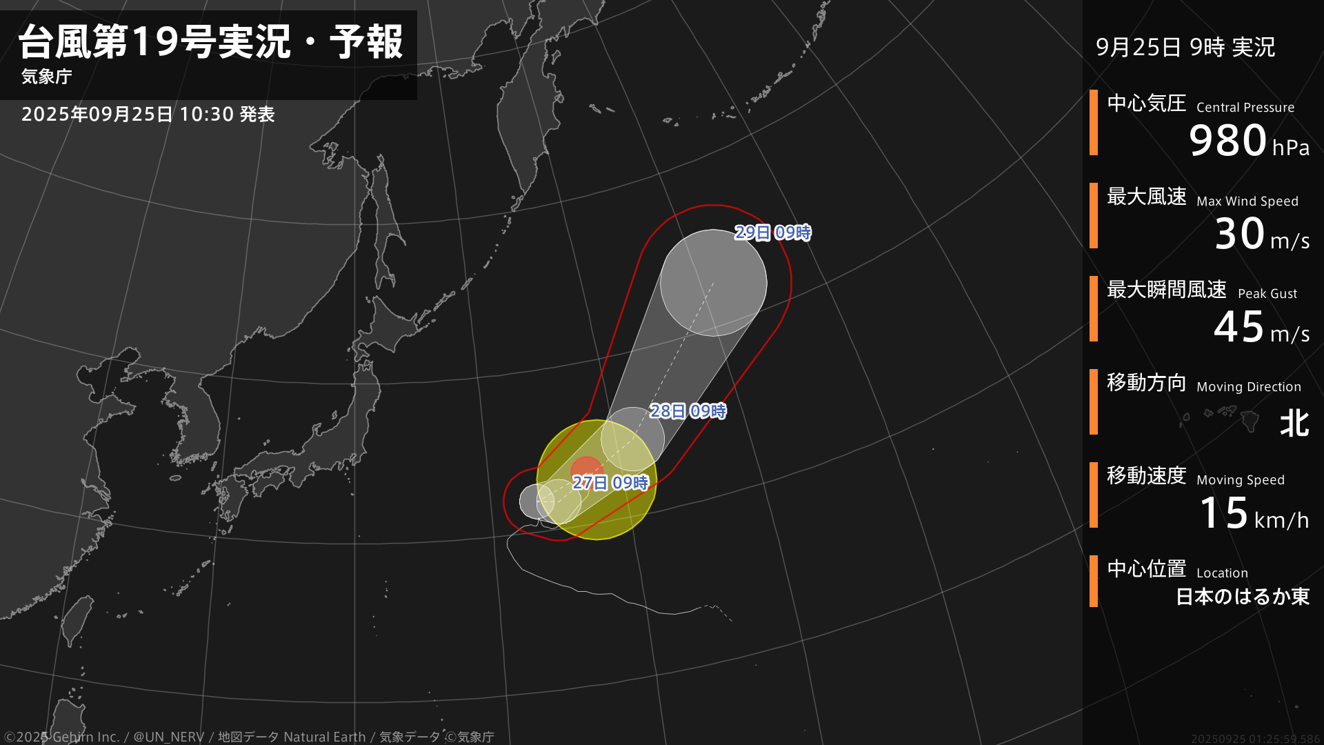 【台風第19号実況・予報 2025年09月25日 10:26】