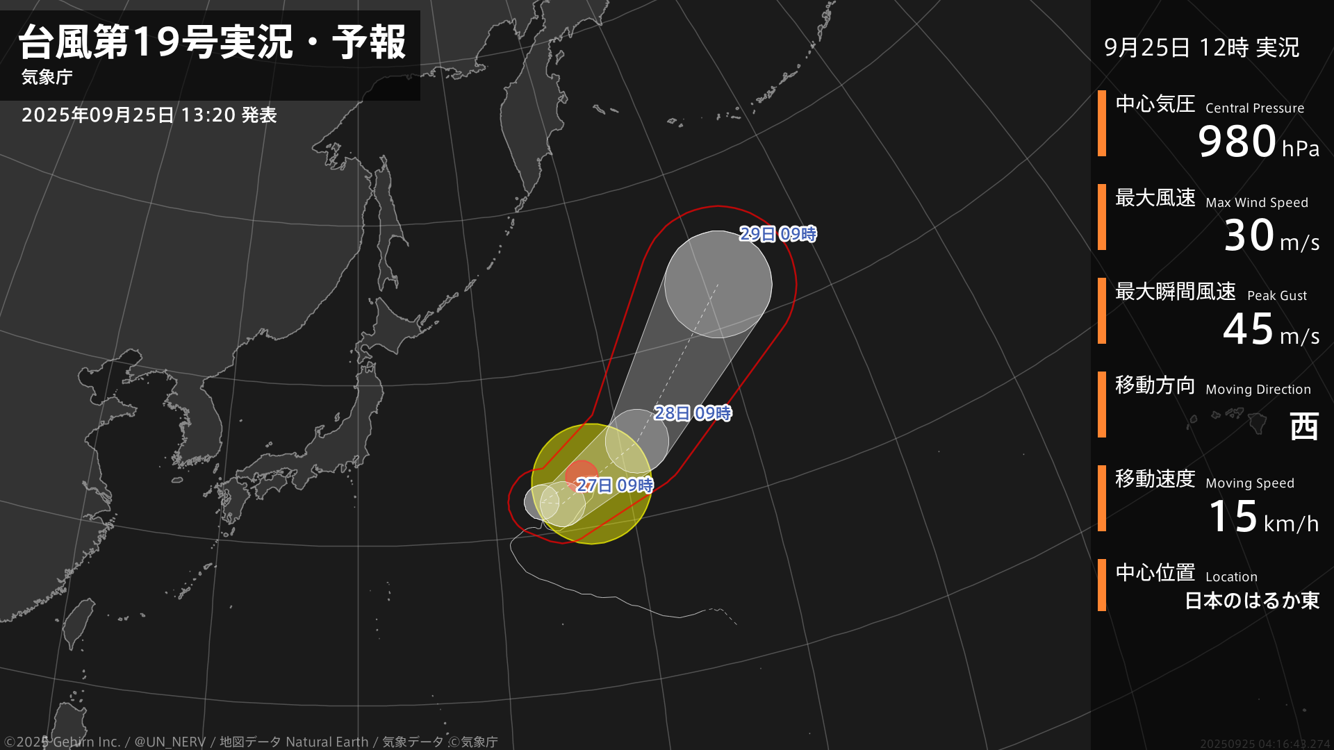 【台風第19号実況・予報 2025年09月25日 13:16】