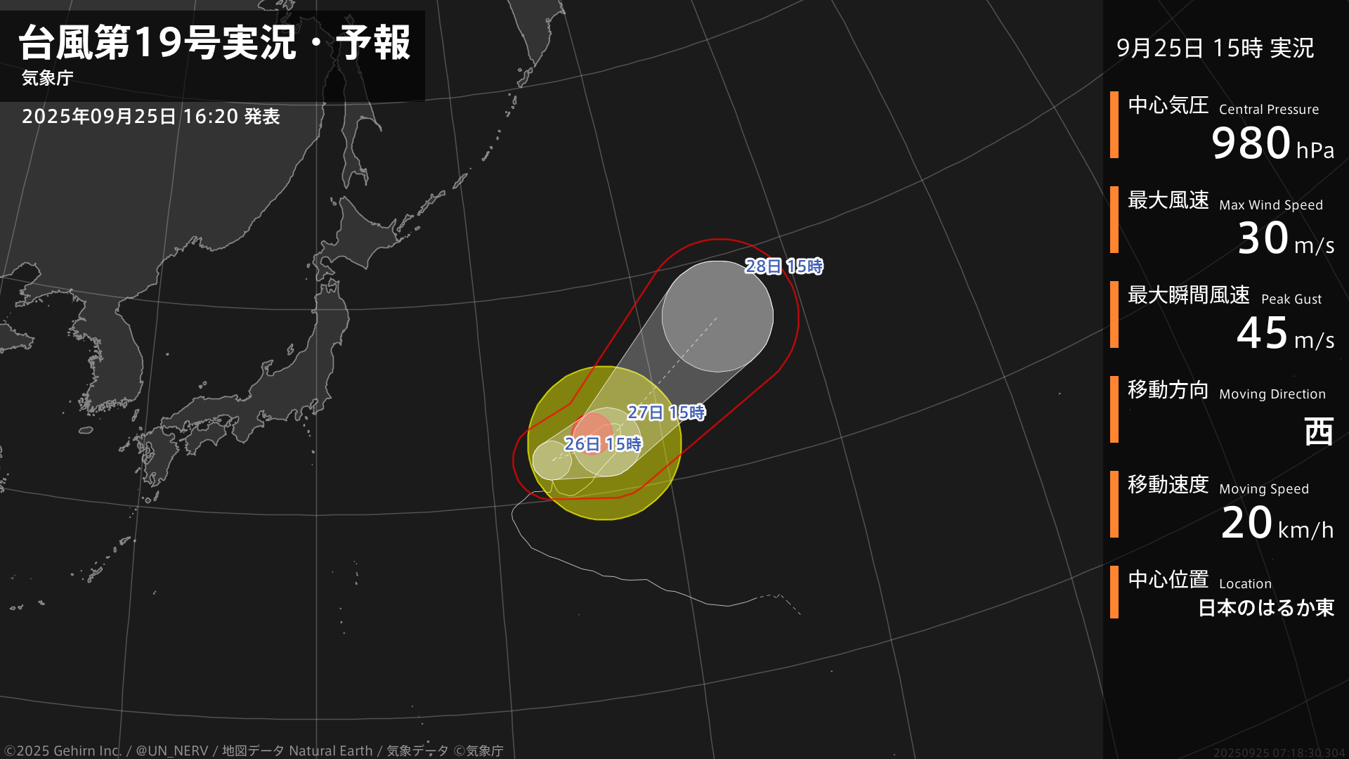 【台風第19号実況・予報 2025年09月25日 16:18】
