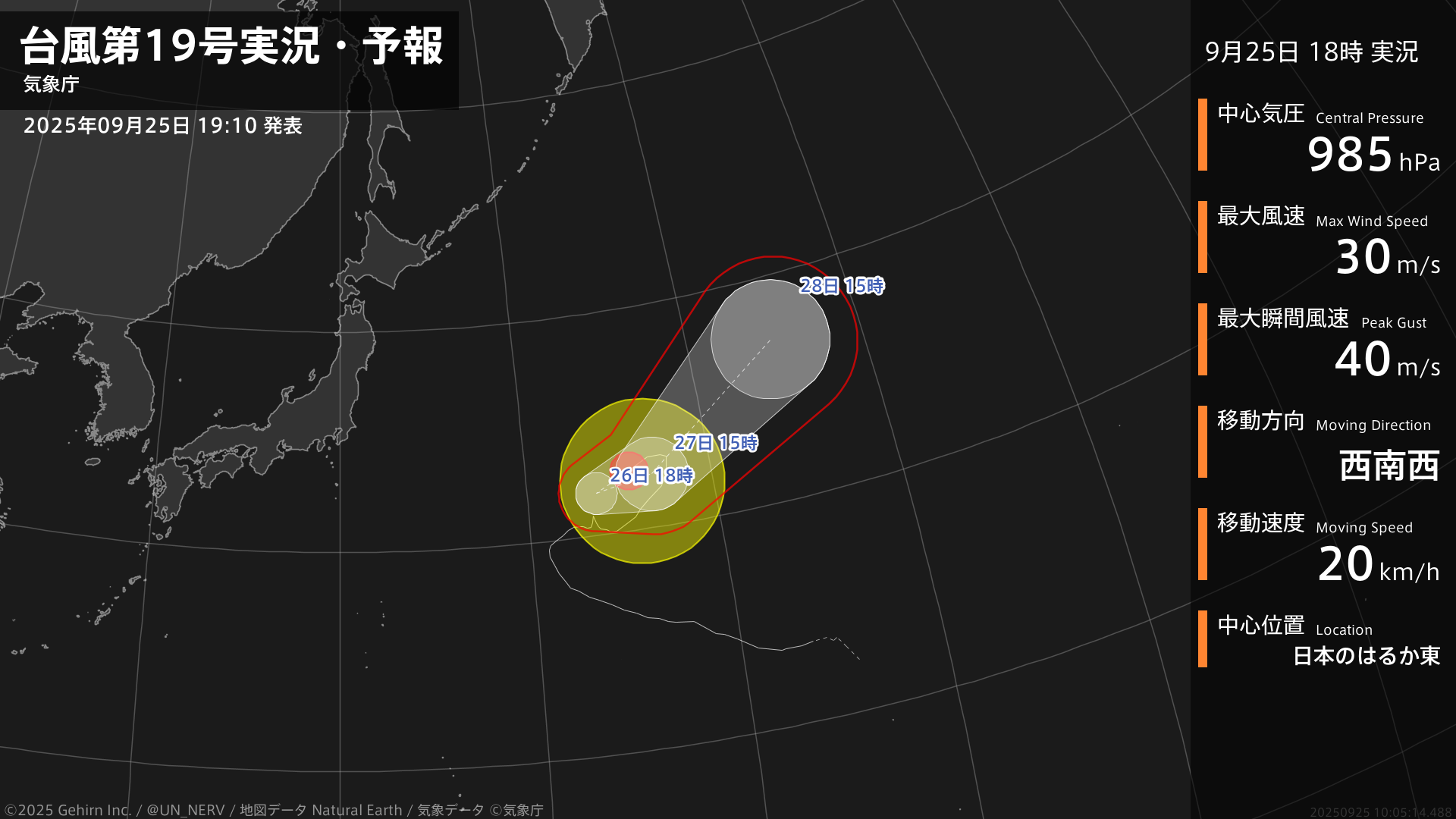 【台風第19号実況・予報 2025年09月25日 19:05】