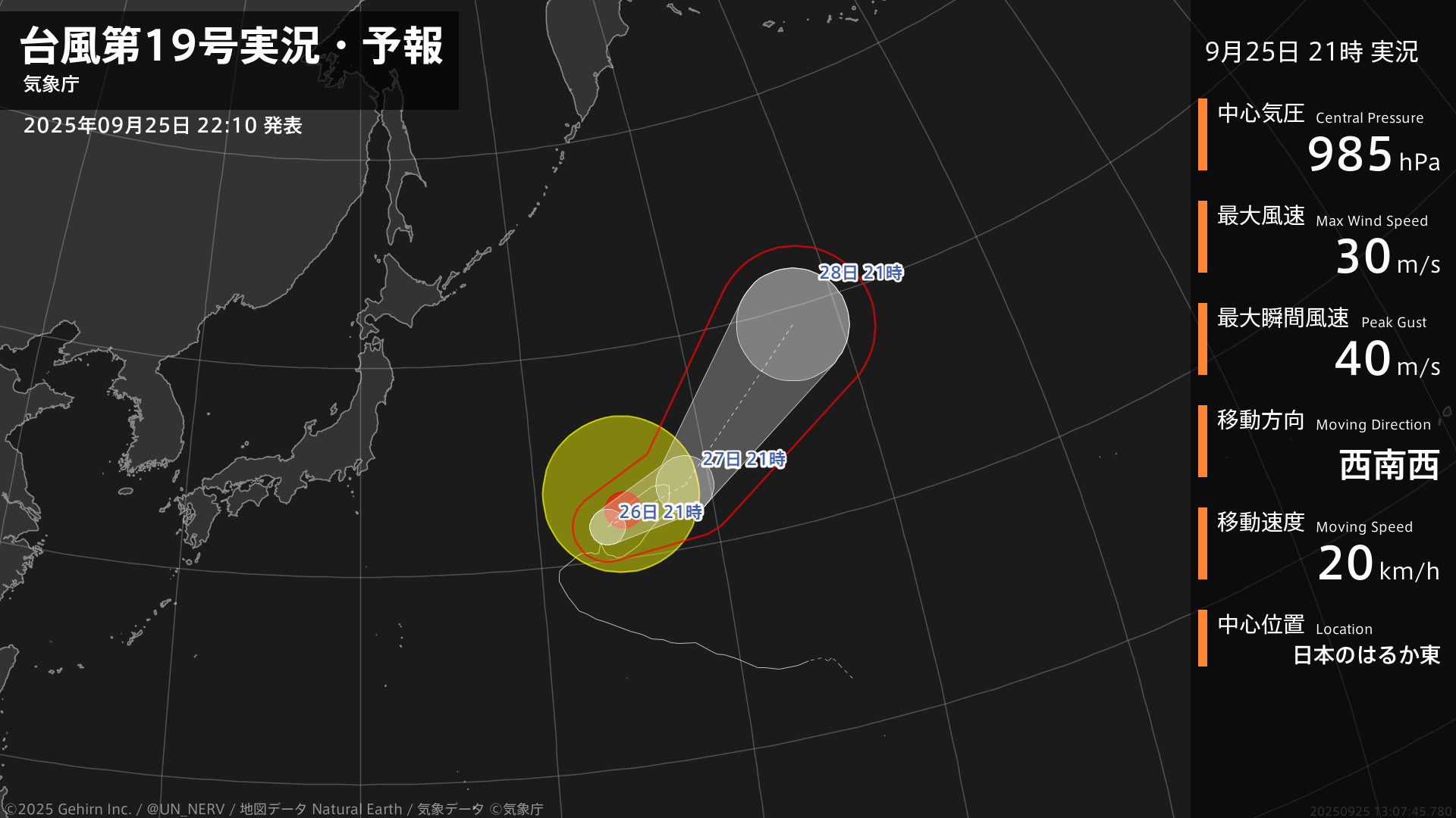 【台風第19号実況・予報 2025年09月25日 22:07】台風第19号(ノグリー)は、日本のはるか東を1時間に20キロの速さで西南西に進んでいます。#台風情報
