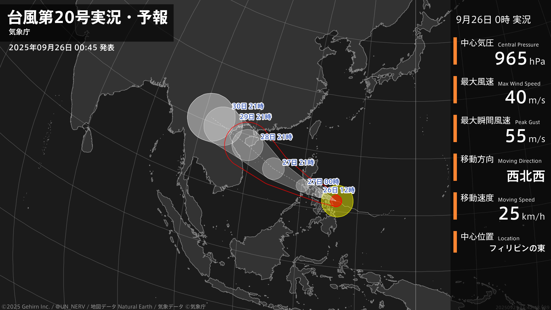 【台風第20号実況・予報 2025年09月26日 00:42】強い台風第20号(ブアローイ)は、フィリピンの東を1時間に25キロの速さで西北西に進んでいます。#台風情報