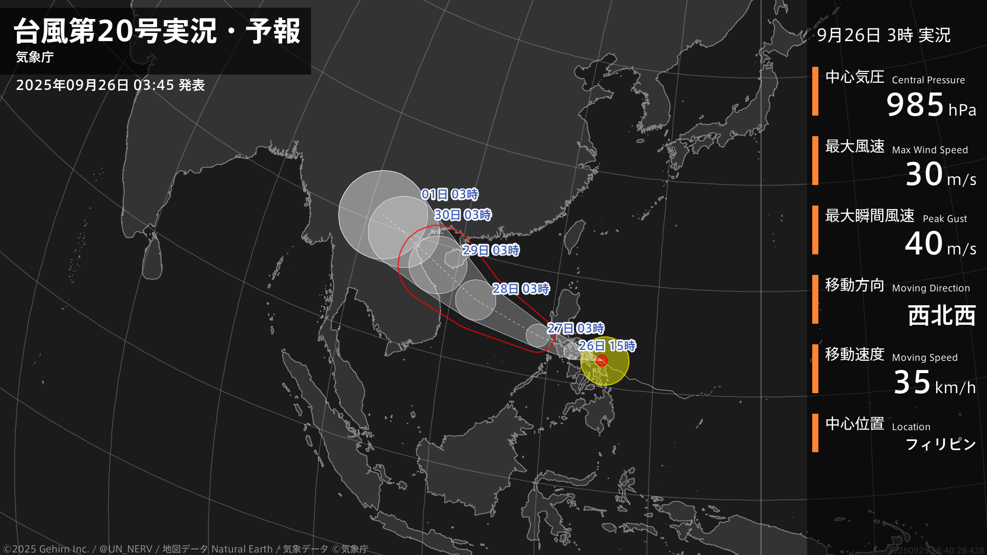 【台風第20号実況・予報 2025年09月26日 03:40】台風第20号(ブアローイ)は、フィリピンを1時間に35キロの速さで西北西に進んでいます。#台風情報