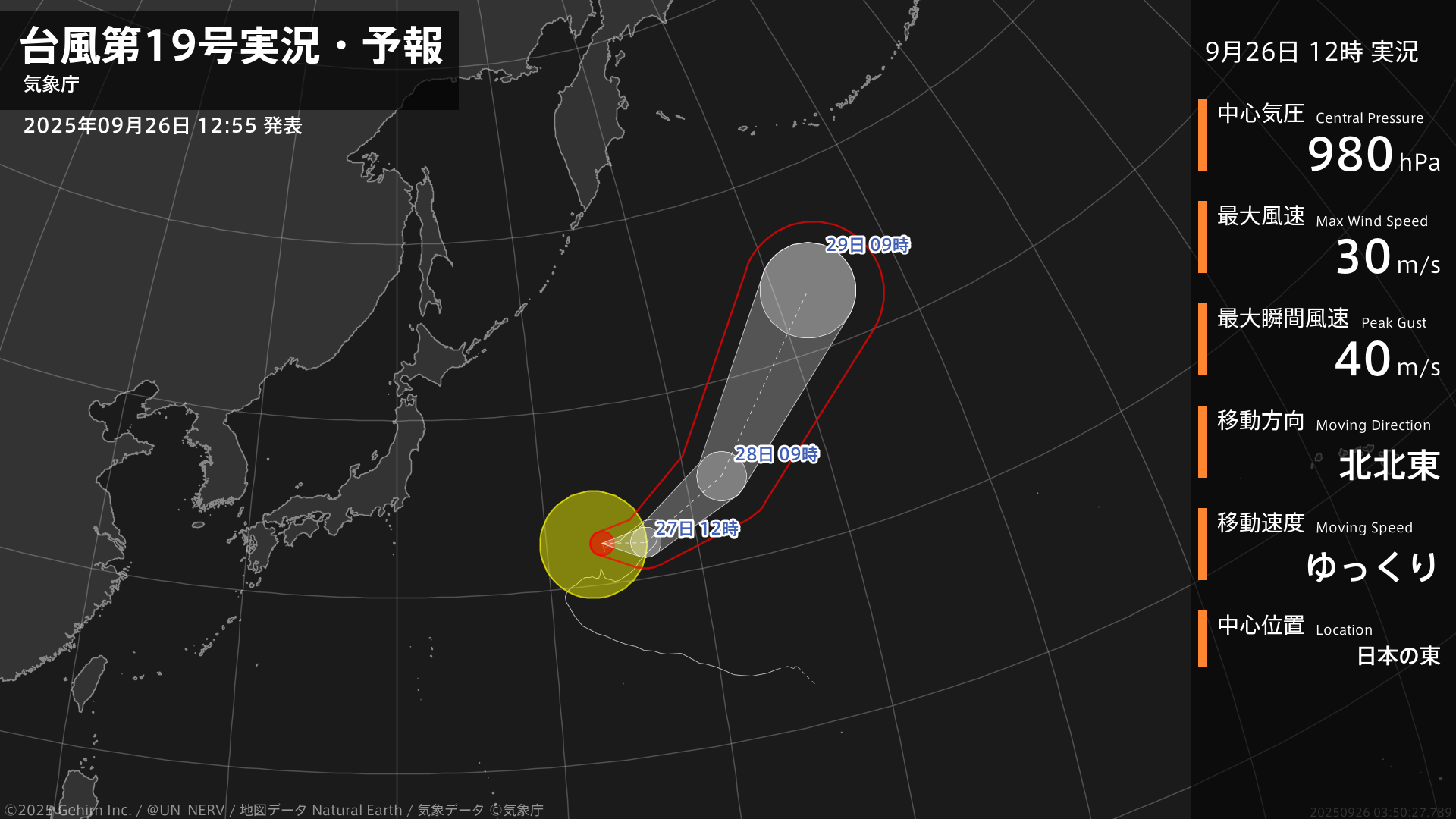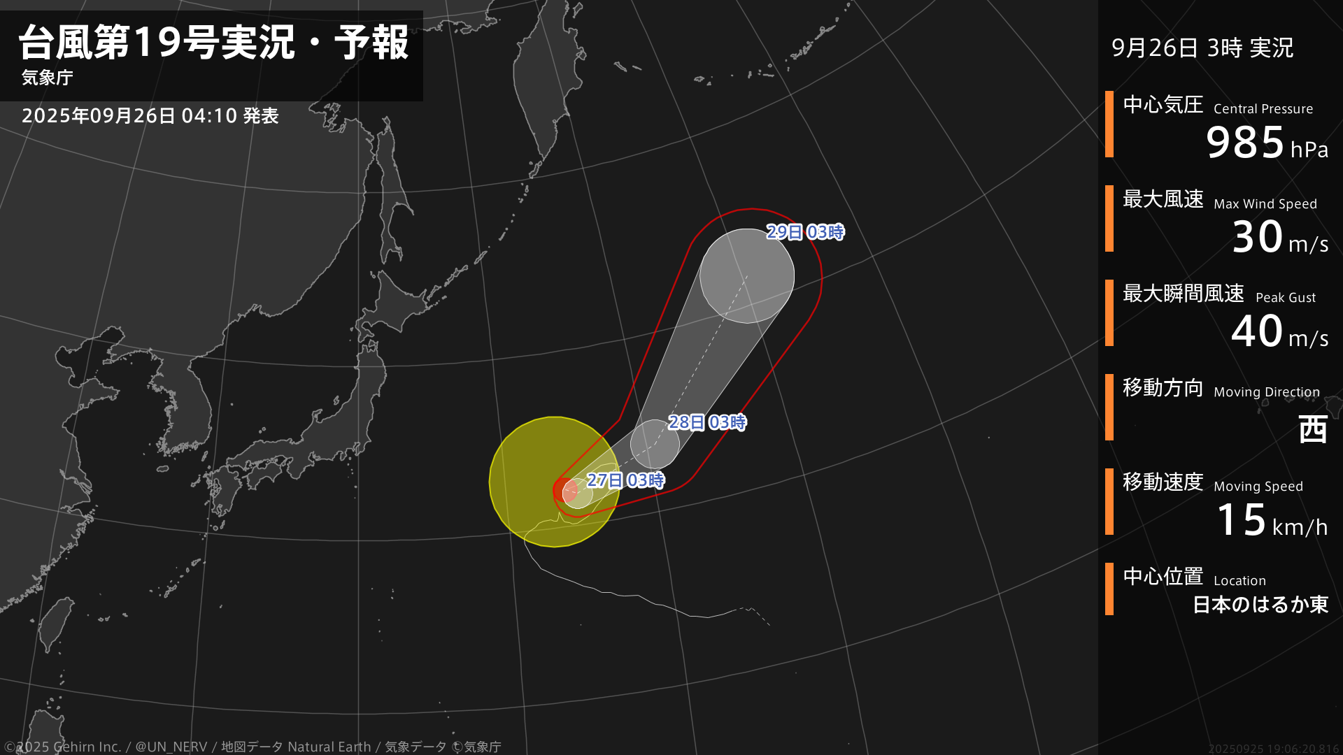 【台風第19号実況・予報 2025年09月26日 04:06】台風第19号(ノグリー)は、日本のはるか東を1時間に15キロの速さで西に進んでいます。#台風情報