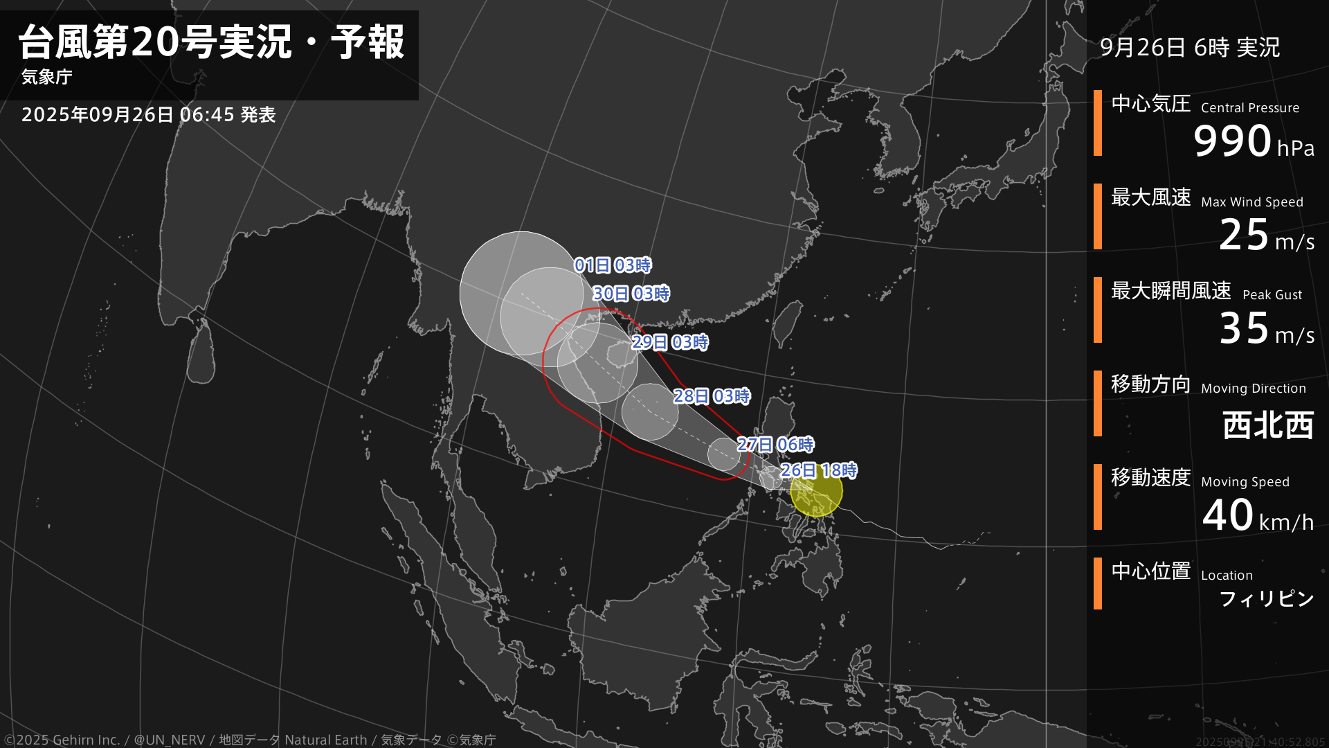 【台風第20号実況・予報 2025年09月26日 06:40】台風第20号(ブアローイ)は、フィリピンを1時間に40キロの速さで西北西に進んでいます。#台風情報