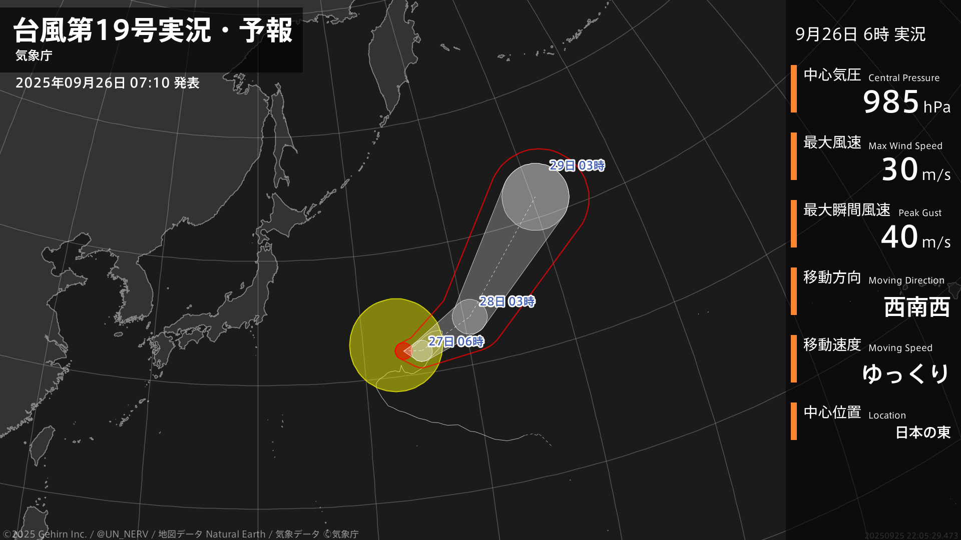 【台風第19号実況・予報 2025年09月26日 07:05】台風第19号(ノグリー)は、日本の東をゆっくりと西南西に進んでいます。#台風情報