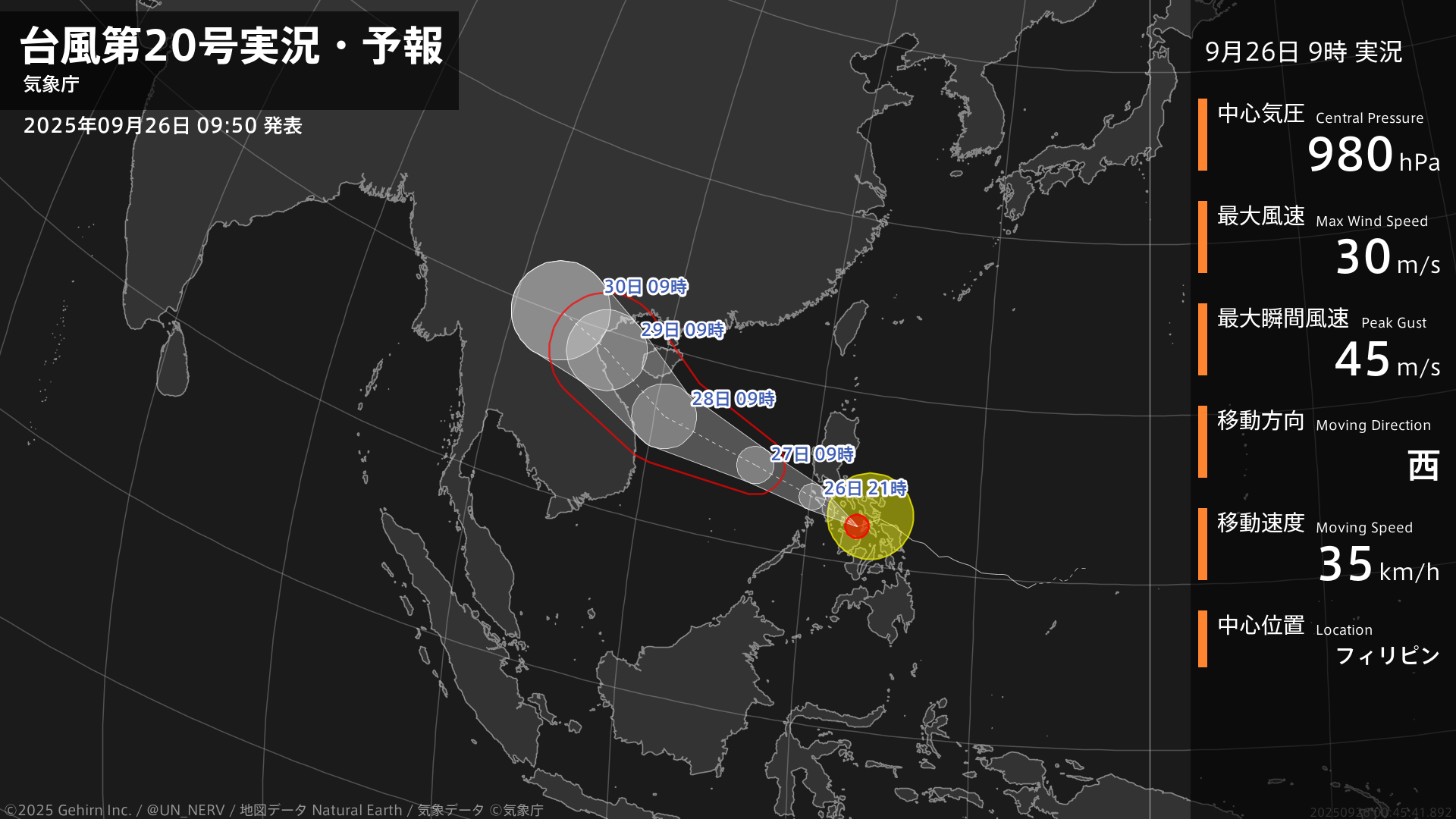 【台風第20号実況・予報 2025年09月26日 09:45】台風第20号(ブアローイ)は、フィリピンを1時間に35キロの速さで西に進んでいます。#台風情報