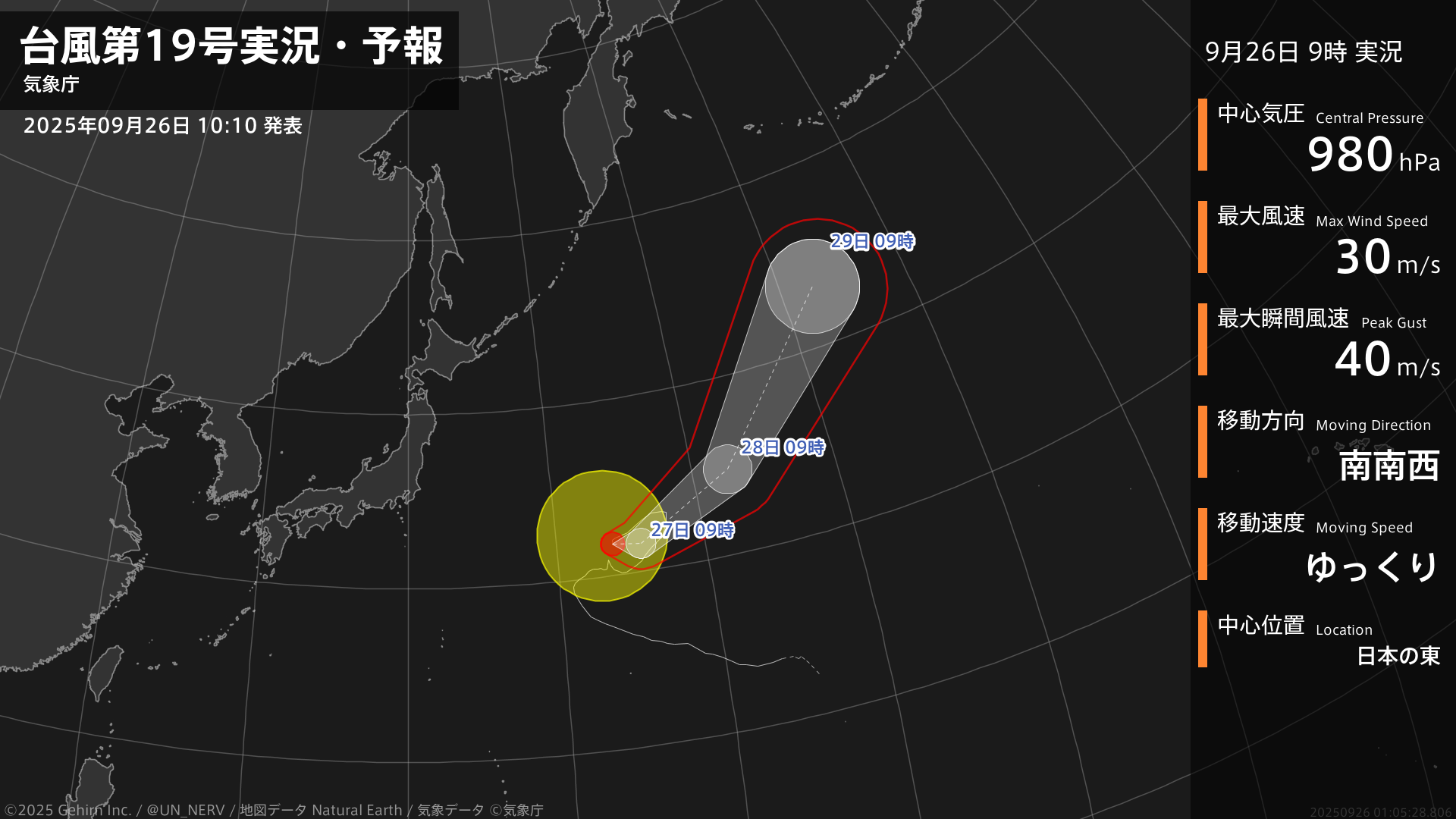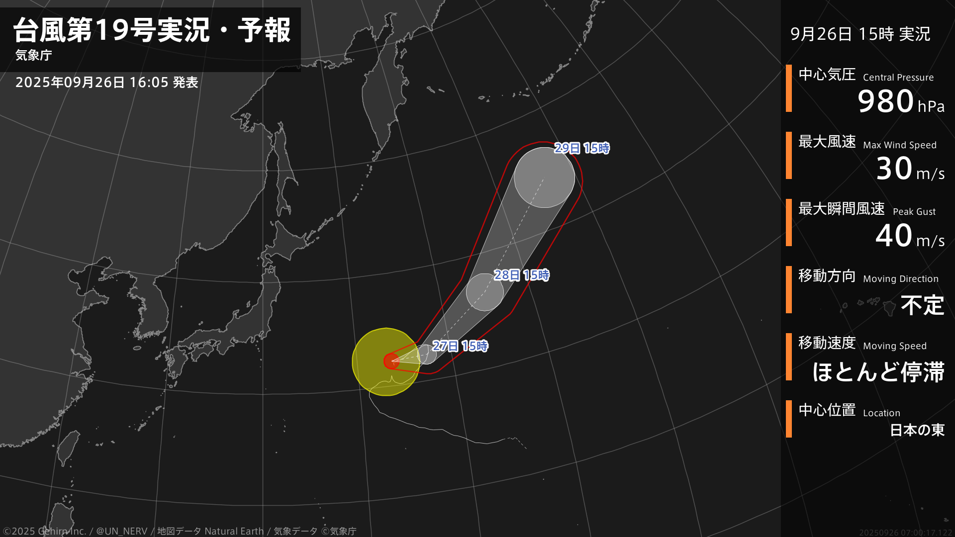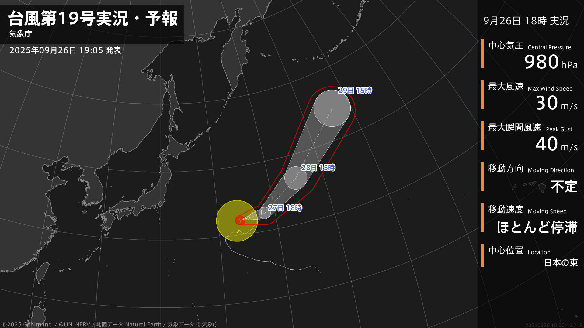 【台風第19号実況・予報 2025年09月26日 19:00】台風第19号(ノグリー)は、日本の東でほとんど停滞しています。#台風情報