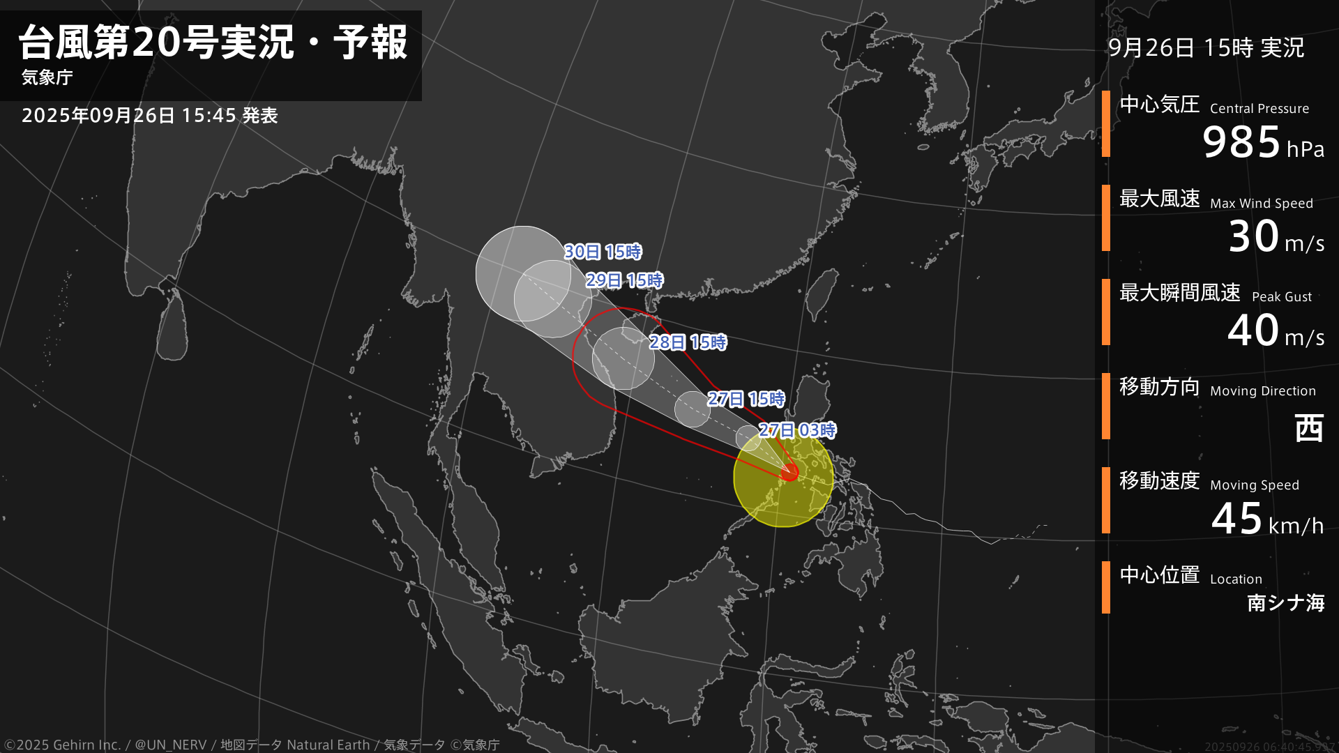 【台風第20号実況・予報 2025年09月26日 15:40】台風第20号(ブアローイ)は、南シナ海を1時間に45キロの速さで西に進んでいます。#台風情報