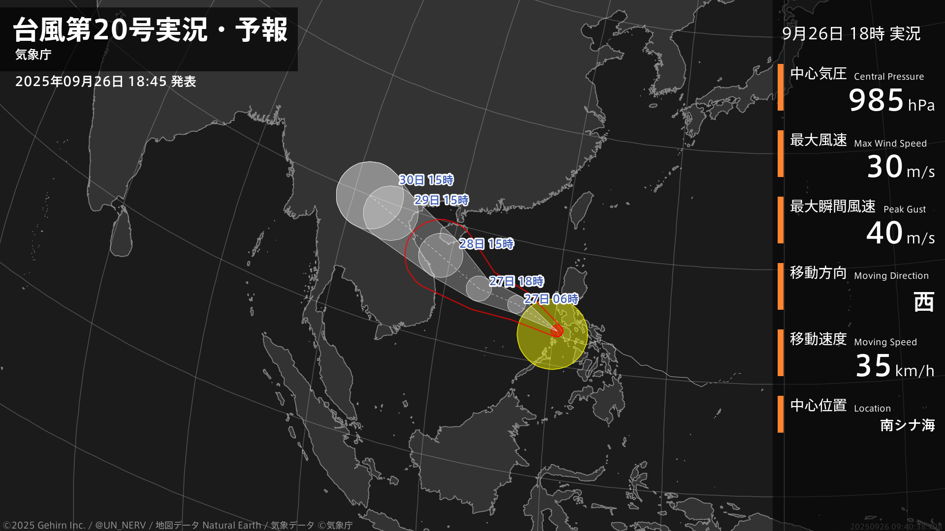 【台風第20号実況・予報 2025年09月26日 18:40】台風第20号(ブアローイ)は、南シナ海を1時間に35キロの速さで西に進んでいます。#台風情報