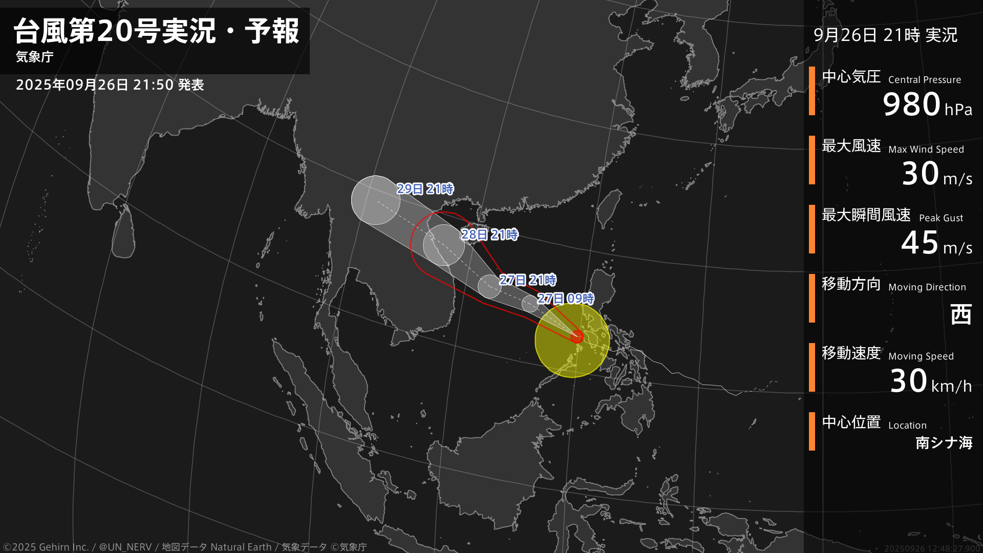 【台風第20号実況・予報 2025年09月26日 21:48】台風第20号(ブアローイ)は、南シナ海を1時間に30キロの速さで西に進んでいます。#台風情報