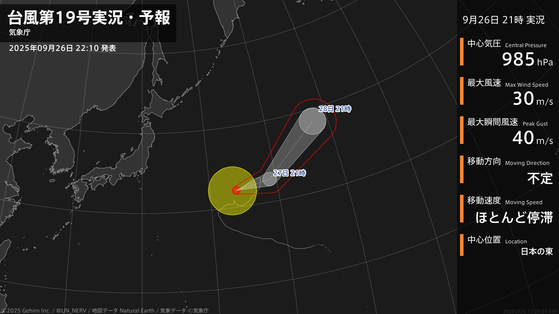 【台風第19号実況・予報 2025年09月26日 22:09】台風第19号(ノグリー)は、日本の東でほとんど停滞しています。#台風情報